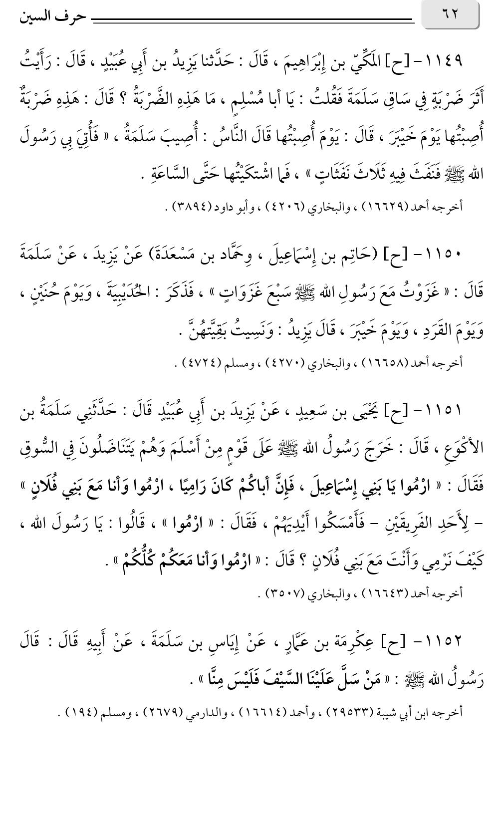 ١١٤٩ - [ح] المَكِّيّ بن إِبْرَاهِيمَ، قَالَ: حَدَّثنا يَزِيدُ بن أَبِي عُبَيْدٍ، قَالَ: رَأَيْتُ أَثَرَ ضَرْبَةٍ فِي سَاقِ سَلَمَةَ فَقُلتُ: يَا أبا مُسْلِمٍ، مَا هَذِهِ الضَّرْبَةُ؟ قَالَ: هَذِهِ ضَرْبَةٌ، أُصِبْتُها يَوْمَ خَيْبَرَ، قَالَ: يَوْمَ أُصِبْتُها قَالَ النَّاسُ: أُصِيبَ سَلَمَةُ «فَأُتِيَ بِي رَسُولَ الله صلى الله عليه وسلم فَنَفَثَ فِيهِ ثَلَاثَ نَفَثَاتٍ»، فَما اشْتكَيْتُها حَتَّى السَّاعَةِ.