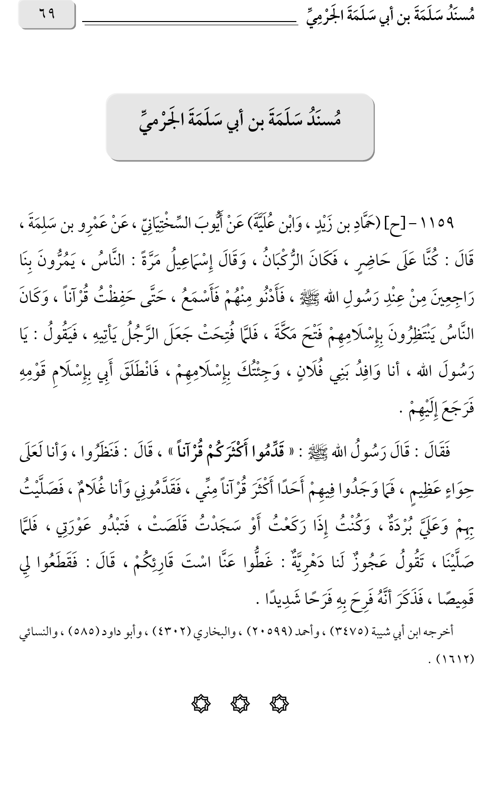 ١١٥٩ - [ح] (حَمَّادِ بن زَيْدٍ، وَابْن عُلَيَّةَ) عَنْ أَيُّوبَ السِّخْتِيَانِيّ، عَنْ عَمْرِو بن سَلِمَةَ، قَالَ: كُنَّا عَلَى حَاضِرٍ، فَكَانَ الرُّكْبَانُ، وَقَالَ إِسْمَاعِيلُ مَرَّةً: النَّاسُ، يَمُرُّونَ بِنَا رَاجِعِينَ مِنْ عِنْدِ رَسُولِ الله صلى الله عليه وسلم، فَأَدْنُو مِنْهُمْ فَأَسْمَعُ، حَتَّى حَفِظْتُ قُرْآنًا، وَكَانَ النَّاسُ يَنْتَظِرُونَ بِإِسْلَامِهِمْ فَتْحَ مَكَّةَ، فَلمَّا فُتِحَتْ جَعَلَ الرَّجُلُ يَأتِيهِ، فَيَقُولُ: يَا رَسُولَ الله، أنا وَافِدُ بَنِي فُلَانٍ، وَجِئْتُكَ بِإِسْلَامِهِمْ، فَانْطَلَقَ أَبِي بِإِسْلَامِ قَوْمِهِ فَرَجَعَ إِلَيْهِمْ.