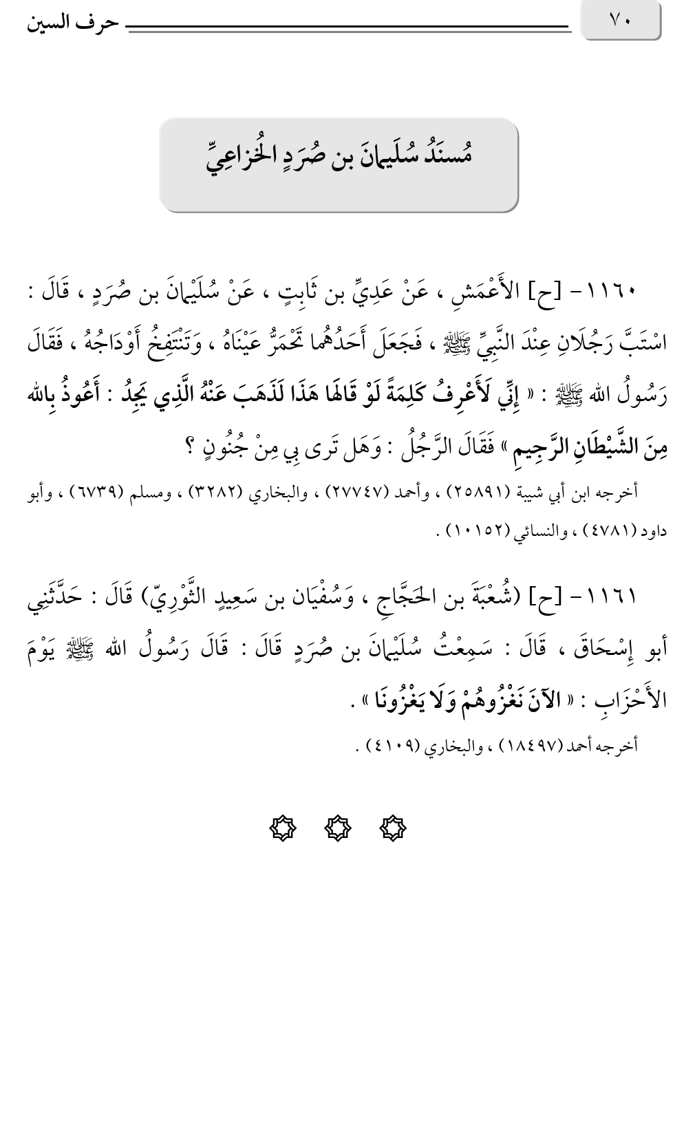 ١١٦١ - [ح] (شُعْبَةَ بن الحَجَّاجِ، وَسُفْيَان بن سَعِيدٍ الثَّوْرِيّ) قَالَ: حَدَّثَنِي أبو إِسْحَاقَ، قَالَ: سَمِعْتُ سُلَيْمانَ بن صُرَدٍ قَالَ: قَالَ رَسُولُ الله صلى الله عليه وسلم يَوْمَ الأَحْزَابِ: «الآنَ نَغْزُوهُمْ وَلَا يَغْزُونَا».