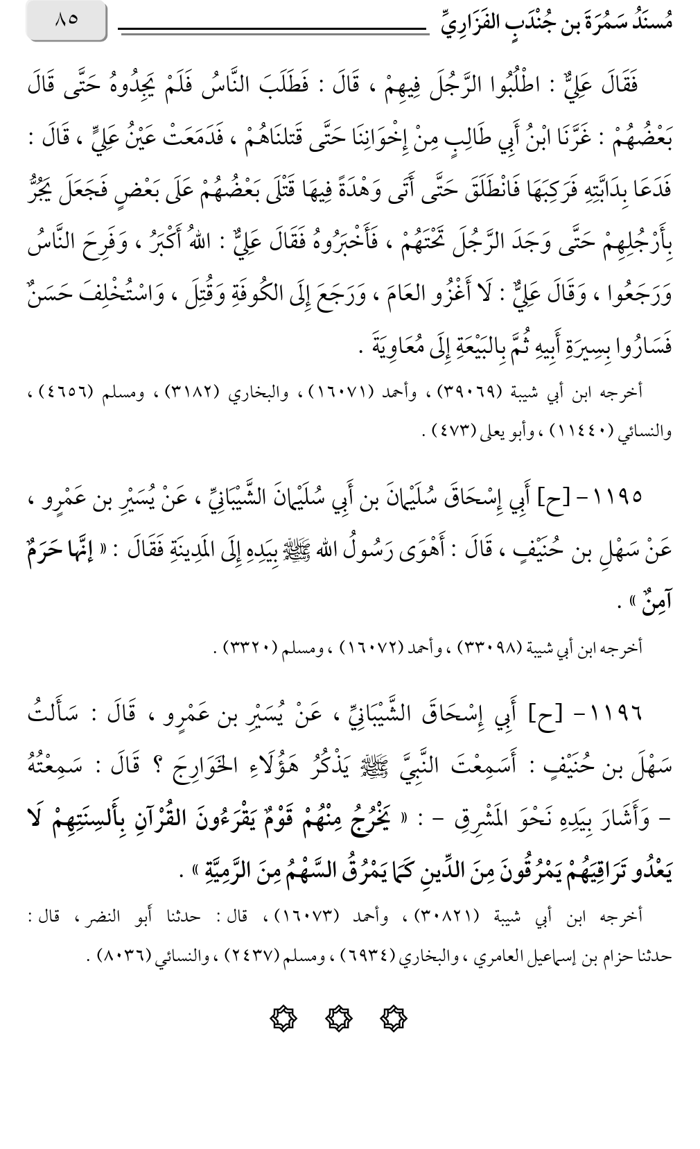 ١١٩٦ - [ح] أَبِي إِسْحَاقَ الشَّيْبَانِيِّ، عَنْ يُسَيْرِ بن عَمْرٍو، قَالَ: سَأَلتُ سَهْلَ بن حُنَيْفٍ: أَسَمِعْتَ النَّبِيَّ صلى الله عليه وسلم يَذْكُرُ هَؤُلَاءِ الخَوَارِجَ؟ قَالَ: سَمِعْتُهُ - وَأَشَارَ بِيَدِهِ نَحْوَ المَشْرِقِ: «يَخْرُجُ مِنْهُمْ قَوْمٌ يَقْرَءُونَ القُرْآنِ بِأَلسِنَتِهِمْ لَا يَعْدُو تَرَاقِيَهُمْ يَمْرُقُونَ مِنَ الدِّينِ كَمَا يَمْرُقُ السَّهْمُ مِنَ الرَّمِيَّةِ».
