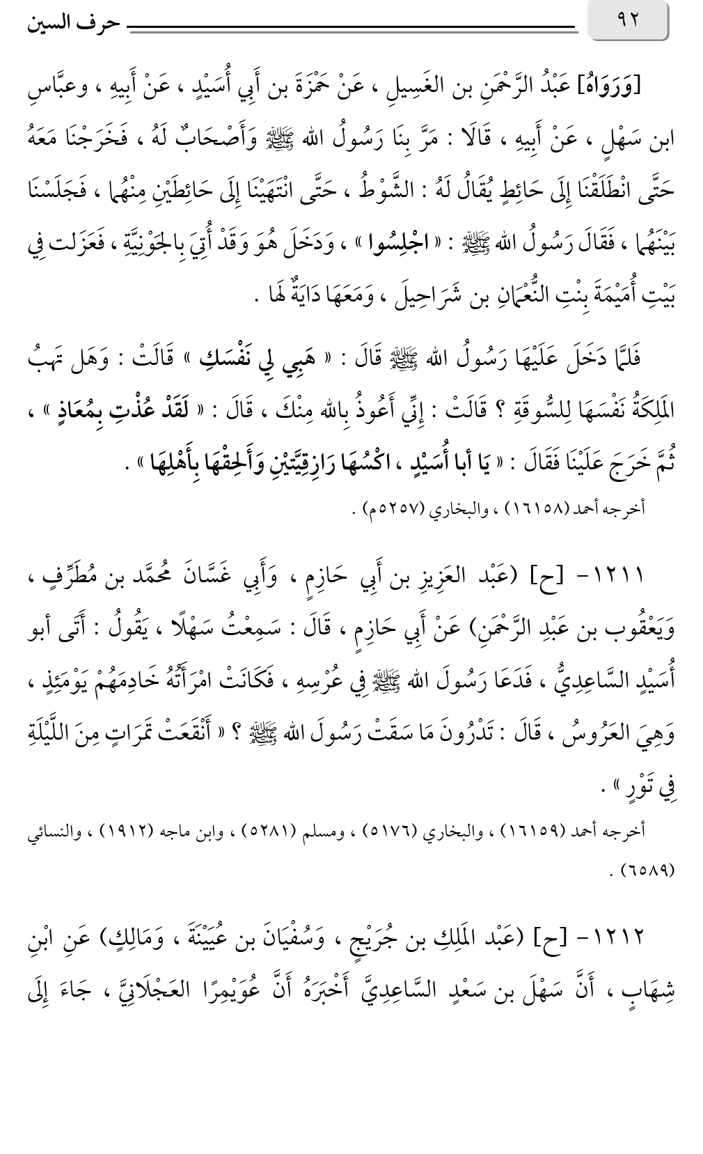 [وَرَوَاهُ] عَبْدُ الرَّحْمَنِ بن الغَسِيلِ، عَنْ حَمْزَةَ بن أَبِي أُسَيْدٍ، عَنْ أَبِيهِ، وعبَّاسِ ابن سَهْلٍ، عَنْ أَبِيهِ، قَالَا: مَرَّ بِنَا رَسُولُ الله صلى الله عليه وسلم وَأَصْحَابٌ لَهُ، فَخَرَجْنَا مَعَهُ حَتَّى انْطَلَقْنَا إِلَى حَائِطٍ يُقَالُ لَهُ: الشَّوْطُ، حَتَّى انْتَهَيْنَا إِلَى حَائِطَيْنِ مِنْهُما، فَجَلَسْنَا بَيْنَهُما، فَقَالَ رَسُولُ الله صلى الله عليه وسلم: «اجْلِسُوا»، وَدَخَلَ هُوَ وَقَدْ أُتِيَ بِالجَوْنِيَّةِ، فَعَزَلت فِي بَيْتِ أُمَيْمَةَ بِنْتِ النُّعْمَانِ بن شَرَاحِيلَ، وَمَعَهَا دَايَةٌ لَها.