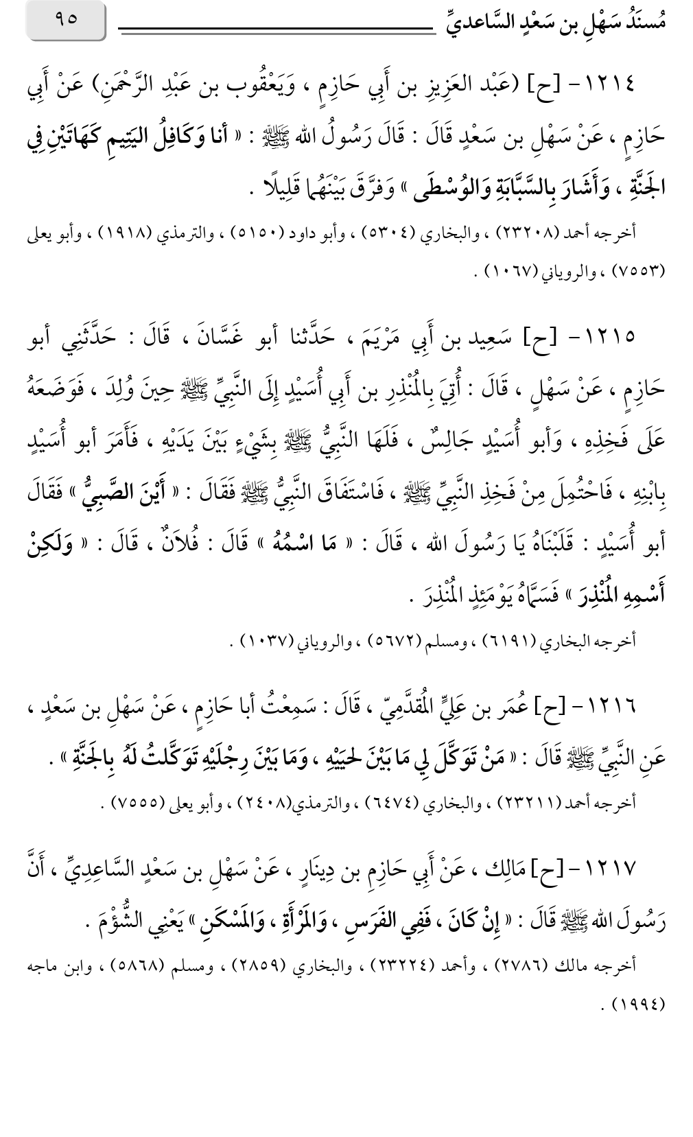 ١٢١٤ - [ح] (عَبْد العَزِيزِ بن أَبِي حَازِمٍ، وَيَعْقُوب بن عَبْدِ الرَّحْمَنِ) عَنْ أَبِي حَازِمٍ، عَنْ سَهْلِ بن سَعْدٍ قَالَ: قَالَ رَسُولُ الله صلى الله عليه وسلم: «أنا وَكَافِلُ اليَتِيمِ كَهَاتَيْنِ فِي الجَنَّةِ، وَأَشَارَ بِالسَّبَّابَةِ وَالوُسْطَى» وَفرَّقَ بَيْنَهُما قَلِيلًا.