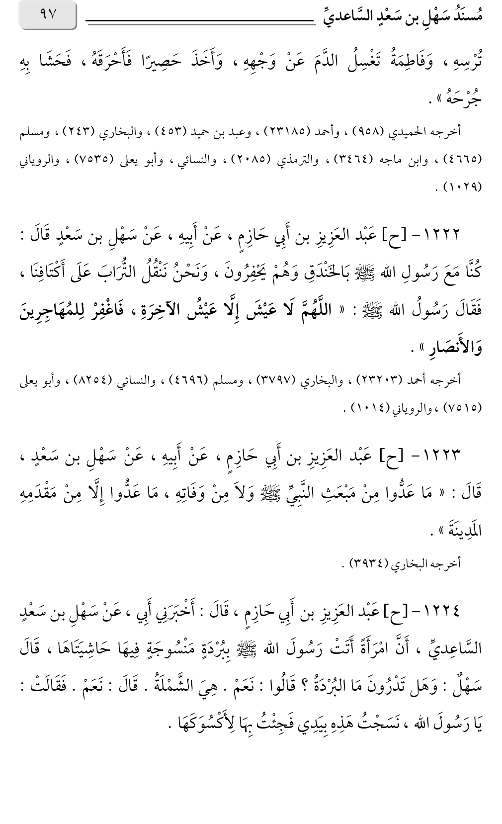 ١٢٢٢ - [ح] عَبْد العَزِيزِ بن أَبِي حَازِمٍ، عَنْ أَبِيهِ، عَنْ سَهْلِ بن سَعْدٍ قَالَ: كُنَّا مَعَ رَسُولِ الله صلى الله عليه وسلم بَالخَنْدَقِ وَهُمْ يَحْفِرُونَ، وَنَحْنُ نَنْقُلُ التُّرَابَ عَلَى أَكْتَافِنَا، فَقَالَ رَسُولُ الله صلى الله عليه وسلم: «اللَّهُمَّ لَا عَيْشَ إِلَّا عَيْشُ الآخِرَةِ، فَاغْفِرْ لِلمُهَاجِرِينَ وَالأَنصَارِ».