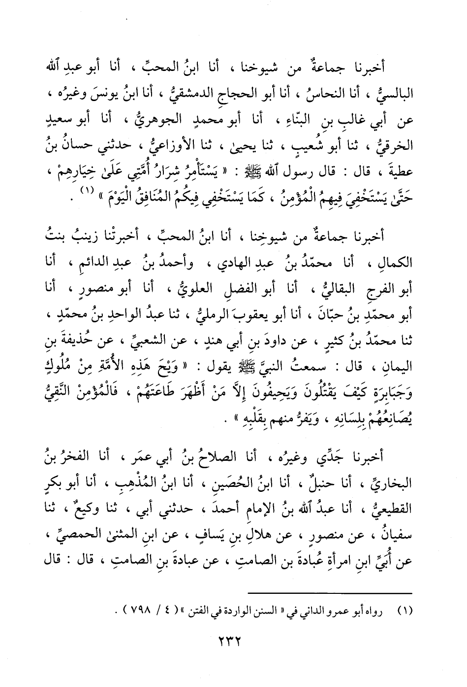 أخبرنا جماعةٌ من شيوخِنا، أنا ابنُ المحبِّ، أخبرتْنا زينبُ بنتُ الكمالِ، أنا محمّدُ بنُ عبدِ الهادي، وأحمدُ بنُ عبدِ الدائمِ، أنا أبو الفرجِ البقاليُّ، أنا أبو الفضلِ العلويُّ، أنا أبو منصورٍ، أنا أبو محمّدِ بنُ حبّانَ، أنا أبو يعقوبَ الرمليُّ، ثنا عبدُ الواحدِ بنُ محمّدٍ، ثنا محمّدُ بنُ كثيرٍ، عن داودَ بنِ أبي هندٍ، عن الشعبيِّ، عن حُذيفةَ بنِ اليمانِ، قال: سمعتُ النبيَّ - صلى الله عليه وسلم - يقول: "وَيْحَ هَذِهِ الأُمَّةِ مِنْ مُلُوكٍ وَجَبَابِرَةٍ كَيْفَ يَقْتُلُونَ وَيَحِيفُونَ إِلَّا مَنْ أَظْهَرَ طَاعَتَهُمْ، فَالْمُؤْمِنْ النَّقِيُّ يُصَانِعُهُمْ بِلِسَانِهِ، وَيَفرُّ منهم بِقَلْبِهِ".
