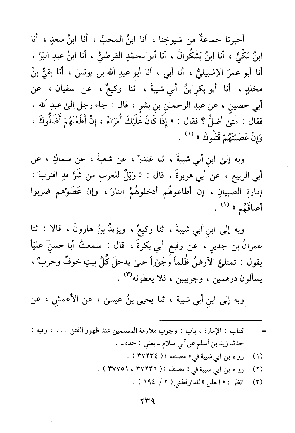 أخبرنا جماعةٌ من شيوخِنا، أنا ابنُ المحبِّ، أنا ابنُ سعدٍ، أنا ابنُ مَكّيٍّ، أنا ابنُ بَشْكُوالُ، أنا أبو محمّدٍ القرطبيُّ، أنا ابنُ عبدِ البَرِّ، أنا أبو عمرَ الإشبيليُّ، أنا أبي، أنا أبو عبدِ الله بن يونسَ، أنا بقيُّ بنُ مخلدٍ، أنا أبو بكر بنُ أبي شيبةَ، ثنا وكيعٌ، عن سفيان، عن أبي حصينٍ، عن عبدِ الرحمنِ بنِ بشرٍ، قال: جاء رجلٌ إلى عبدِ الله، فقال: متى أضلُّ؟ فقال: "إِذَا كَانَ عَلَيْكَ أُمَرَاءُ، إِنْ أَطَعْتَهُمْ أَضَلُّوكَ، وَإِنْ عَصَيْتَهُمْ قَتَلُوكَ" (¬1).