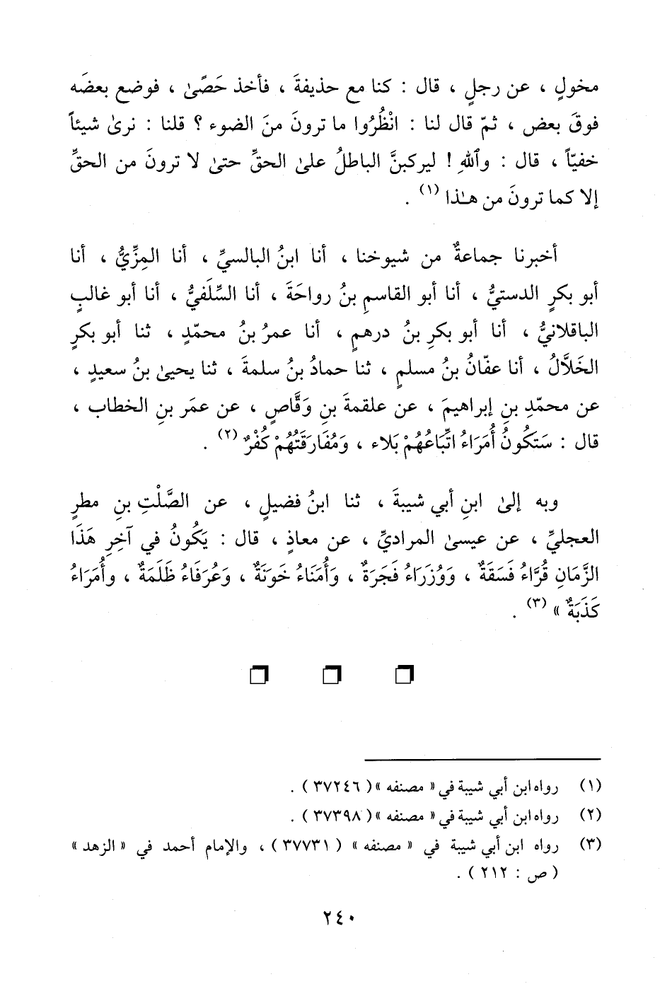 أخبرنا جماعةٌ من شيوخنا، أنا ابنُ البالسيِّ، أنا المِزِّيُّ، أنا أبو بكرٍ الدستيُّ، أنا أبو القاسمِ بنُ رواحَةَ، أنا السِّلَفيُّ، أنا أبو غالبٍ الباقلانيُّ، أنا أبو بكرِ بنُ درهمٍ، أنا عمرُ بنُ محمّدٍ، ثنا أبو بكرٍ الخَلاَّلُ، أنا عفّانُ بنُ مسلمٍ، ثنا حمادُ بنُ سلمةَ، ثنا يحيى بنُ سعيدٍ، عن محمّدِ بنِ إبراهيمَ، عن علقمةَ بنِ وَقَّاصٍ، عن عمَر بنِ الخطاب، قال: سَتكونُ أُمَرَاءُ اتّبَاعُهُمْ بَلاء، وَمُفَارَقَتُهُمْ كُفْرٌ (¬2).