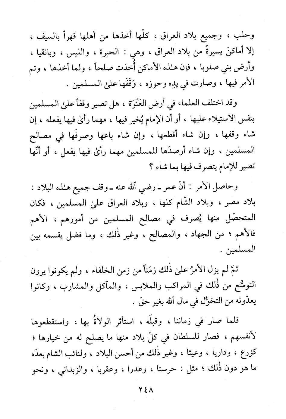 وحاصل الأمر: أنّ عمر -رضي الله عنه- وقف جميع هذه البلاد: بلاد مصر، وبلاد الشّام كلها، وبلاد العراق على المسلمين، فكان المتحصّل منها يُصرف في مصالح المسلمين من أمورهم، الأهم فالأهم؛ من الجهاد، والمصالح، وغير ذلك، وما فضل يقسمه بين المسلمين.