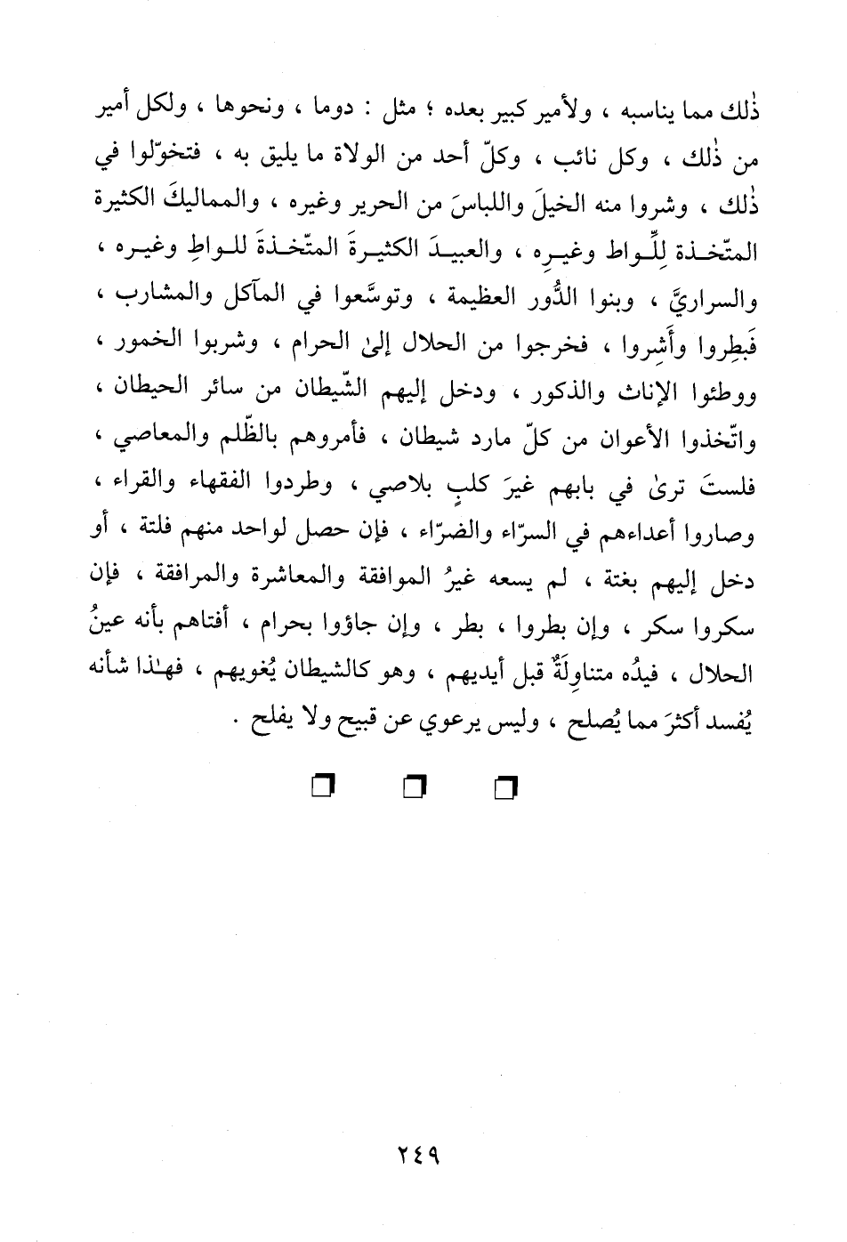 ذلك مما يناسبه، ولأمير كبير بعده؛ مثل: دوما، ونحوها، ولكل أمير من ذلك، وكل نائب، وكلّ أحد من الولاة ما يليق به، فتخوّلوا في ذلك، وشروا منه الخيلَ واللباسَ من الحرير وغيره، والمماليكَ الكثيرة المتّخذة لِلِّواط وغيرِه، والعبيدَ الكثيرةَ المتّخذةَ للواطِ وغيره، والسراريَّ، وبنوا الدُّور العظيمة، وتوسَّعوا في المآكل والمشارب، فَبطِروا وأَشِروا، فخرجوا من الحلال إلى الحرام، وشربوا الخمور، ووطئوا الإناث والذكور، ودخل إليهم الشّيطان من سائر الحيطان، واتّخذوا الأعوان من كلّ مارد شيطان، فأمروهم بالظّلم والمعاصي، فلستَ ترى في بابهم غيرَ كلبٍ بلاصي، وطردوا الفقهاء والقراء، وصاروا أعداءهم في السرّاء والضرّاء، فإن حصل لواحد منهم فلتة، أو دخل إليهم بغتة، لم يسعه غيرُ الموافقة والمعاشرة والمرافقة، فإن سكروا سكر، وإن بطروا، بطر، وإن جاؤوا بحرام، أفتاهم بأنه عينُ الحلال، فيدُه متناوِلَةٌ قبل أيديهم، وهو كالشيطان يُغويهم، فهذا شأنه يُفسد أكثرَ مما يُصلح، وليس يرعوي عن قبيح ولا يفلح.