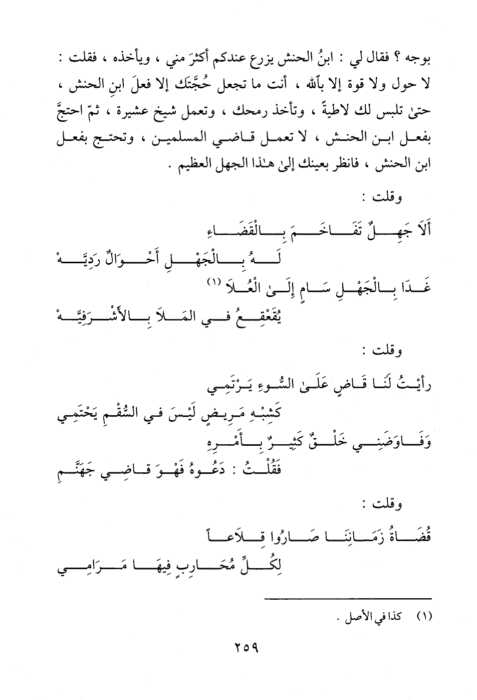 بوجه؟ فقال لي: ابنُ الحنش يزرع عندكم أكثرَ مني، ويأخذه، فقلت: لا حول ولا قوة إلا بالله، أنت ما تجعل حُجَّتَك إلا فعلَ ابنِ الحنش، حتى تلبس لك لاطيةً، وتأخذ رمحك، وتعمل شيخ عشيرة، ثمّ احتجَّ بفعل ابن الحنش، لا تعمل قاضي المسلمين، وتحتج بفعل ابن الحنش، فانظر بعينك إلى هذا الجهل العظيم.