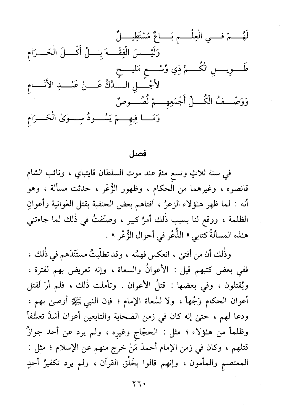 في سنة ثلاثٍ وتسعِ مئةً عند موت السلطان قايتباي، ونائب الشام قانصوه، وغيرهما من الحكام، وظهور الزُّعْر، حدثت مسألة، وهو أنه: لما ظهر هؤلاء الزعرُ، أفتاهم بعض الحنفية بقتل العَوانية وأعوانِ الظلمة، ووقع لنا بسبب ذلك أمرٌ كبير، وصنّفتُ في ذلك لما جاءتني هذه المسألةُ كتابي "الذُّعْر في أحوال الزُّعْر".