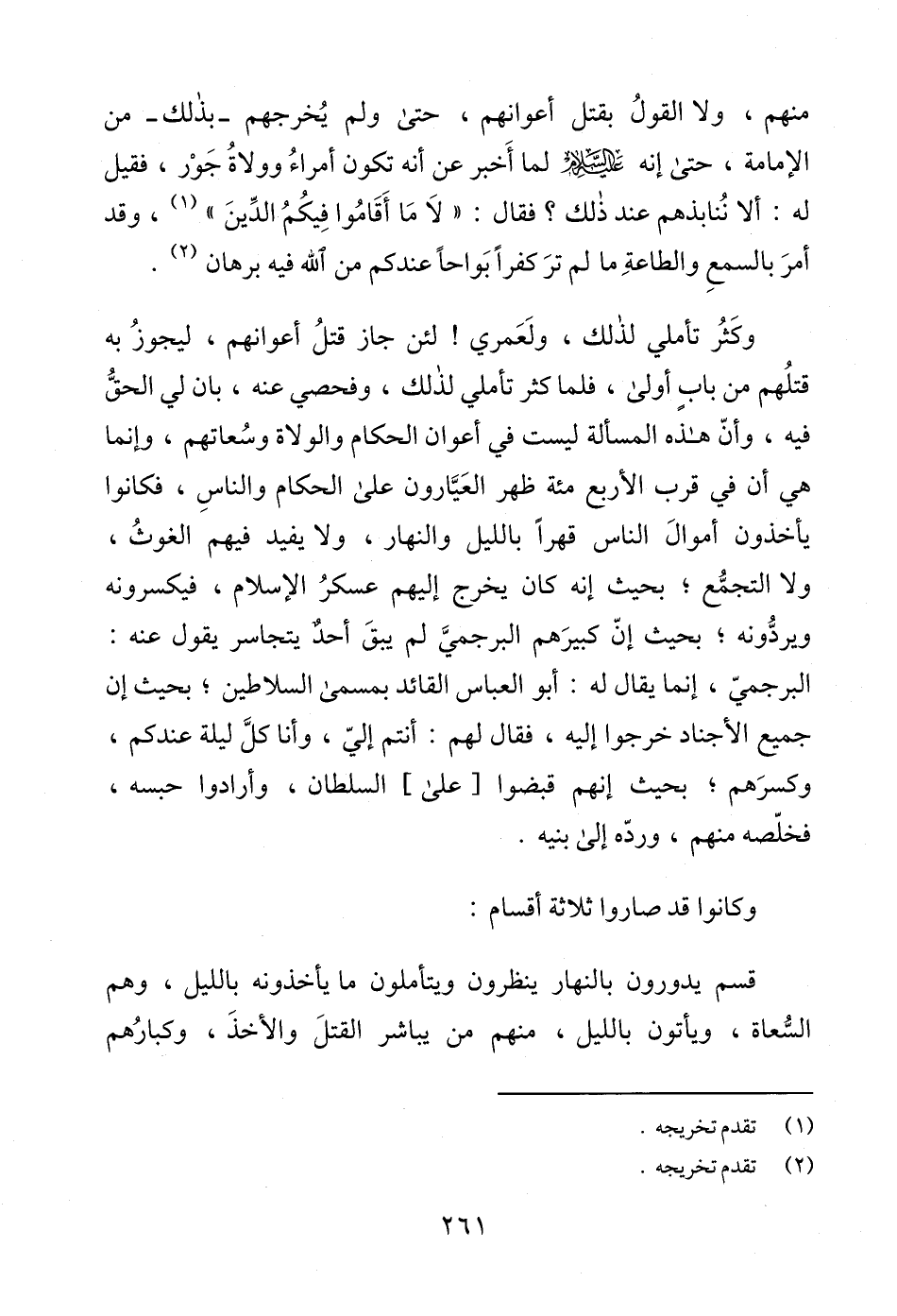 وكَثرُ تأملي لذلك، ولَعَمري! لئن جاز قتلُ أعوانهم، ليجوزُ به قتلُهم من بابٍ أولى، فلما كثر تأملي لذلك، وفحصي عنه، بان لي الحقُّ فيه، وأنّ هذه المسألة ليست في أعوان الحكام والولاة وسُعاتهم، وإنما هي أن في قرب الأربع مئة ظهر العَيَّارون على الحكام والناسِ، فكانوا يأخذون أموالَ الناس قهراً بالليل والنهار، ولا يفيد فيهم الغوثُ، ولا التجمُّع؛ بحيث إنه كان يخرج إليهم عسكرُ الإسلام، فيكسرونه ويردُّونه؛ بحيث إنّ كبيرَهم البرجميَّ لم يبقَ أحدٌ يتجاسر يقول عنه: البرجميّ، إنما يقال له: أبو العباس القائد بمسمى السلاطين؛ بحيث إن جميع الأجناد خرجوا إليه، فقال لهم: أنتم إليّ، وأنا كلَّ ليلة عندكم، وكسرَهم؛ بحيث إنهم قبضوا [على] السلطان، وأرادوا حبسه، فخلّصه منهم، وردّه إلى بنيه.