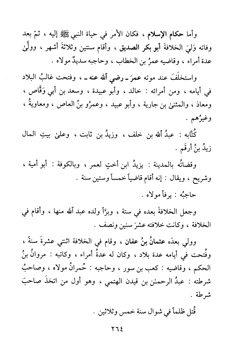 وأما حكام الإسلام، فكان الأمر في حياة النبي - صلى الله عليه وسلم - إليه، ثمّ بعد وفاته وَليَ الخلافةَ أبو بكر الصديق، وأقام سنتين وثلاثةَ أشهر، وولَّى عدة أمراء، وقاضيه عمرُ بن الخطاب، وحاجبه سديدٌ مولاه.