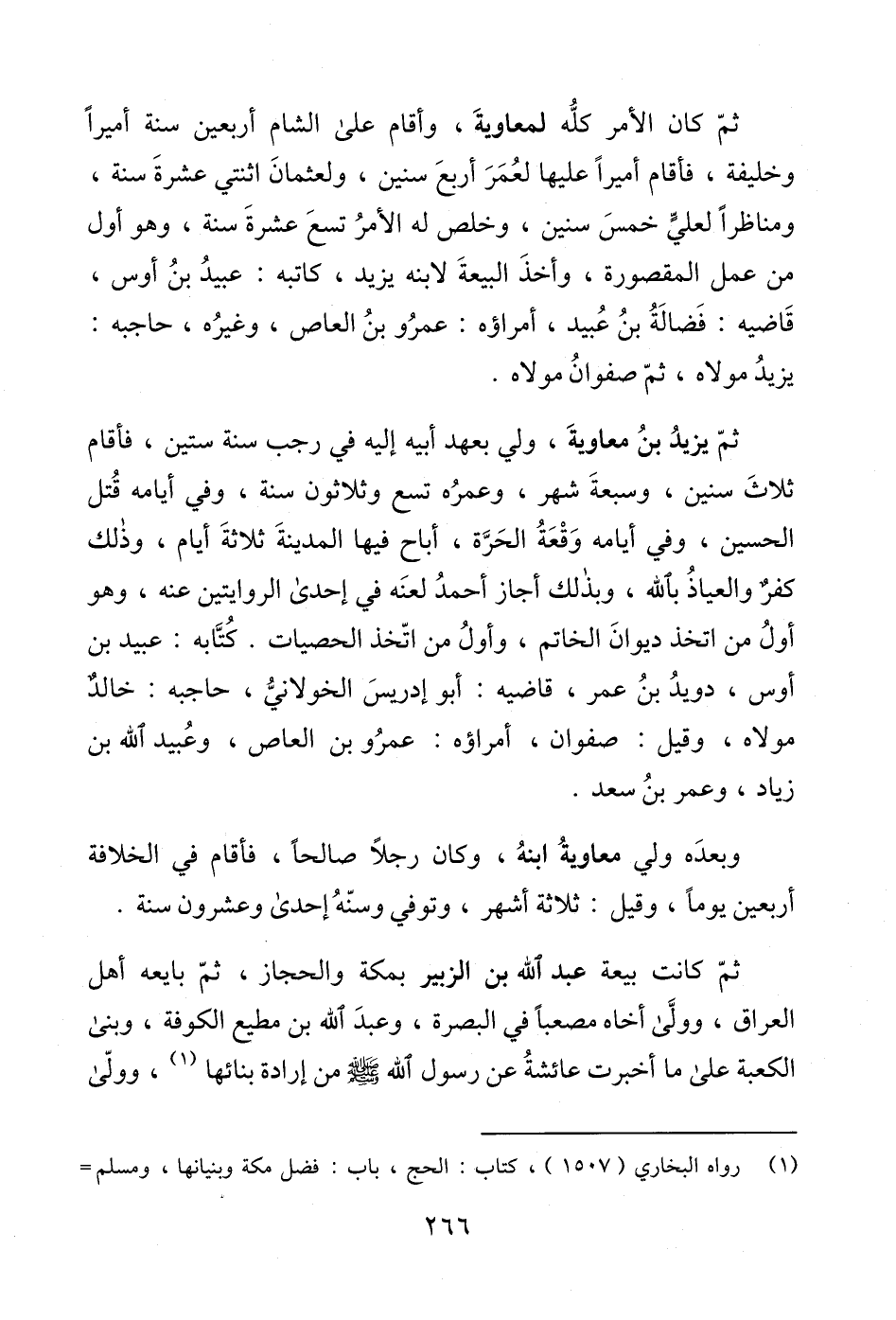 ثمّ يزيدُ بنُ معاويةَ، ولي بعهد أبيه إليه في رجب سنة ستين، فأقام ثلاثَ سنين، وسبعةَ شهر، وعمرُه تسع وثلاثون سنة، وفي أيامه قُتل الحسين، وفي أيامه وَقْعَةُ الحَرَّة، أباح فيها المدينةَ ثلاثةَ أيام، وذلك كفرٌ والعياذُ بالله، وبذلك أجاز أحمدُ لعنَه في إحدى الروايتين عنه، وهو أولُ من اتخذ ديوانَ الخاتم، وأولُ من اتّخذ الحصيات. كُتَّابه: عبيد بن أوس، دويدُ بنُ عمر، قاضيه: أبو إدريسَ الخولانيُّ، حاجبه: خالدٌ مولاه، وقيل: صفوان، أمراؤه: عمرُو بن العاص، وعُبيد الله بن زياد، وعمر بنُ سعد.