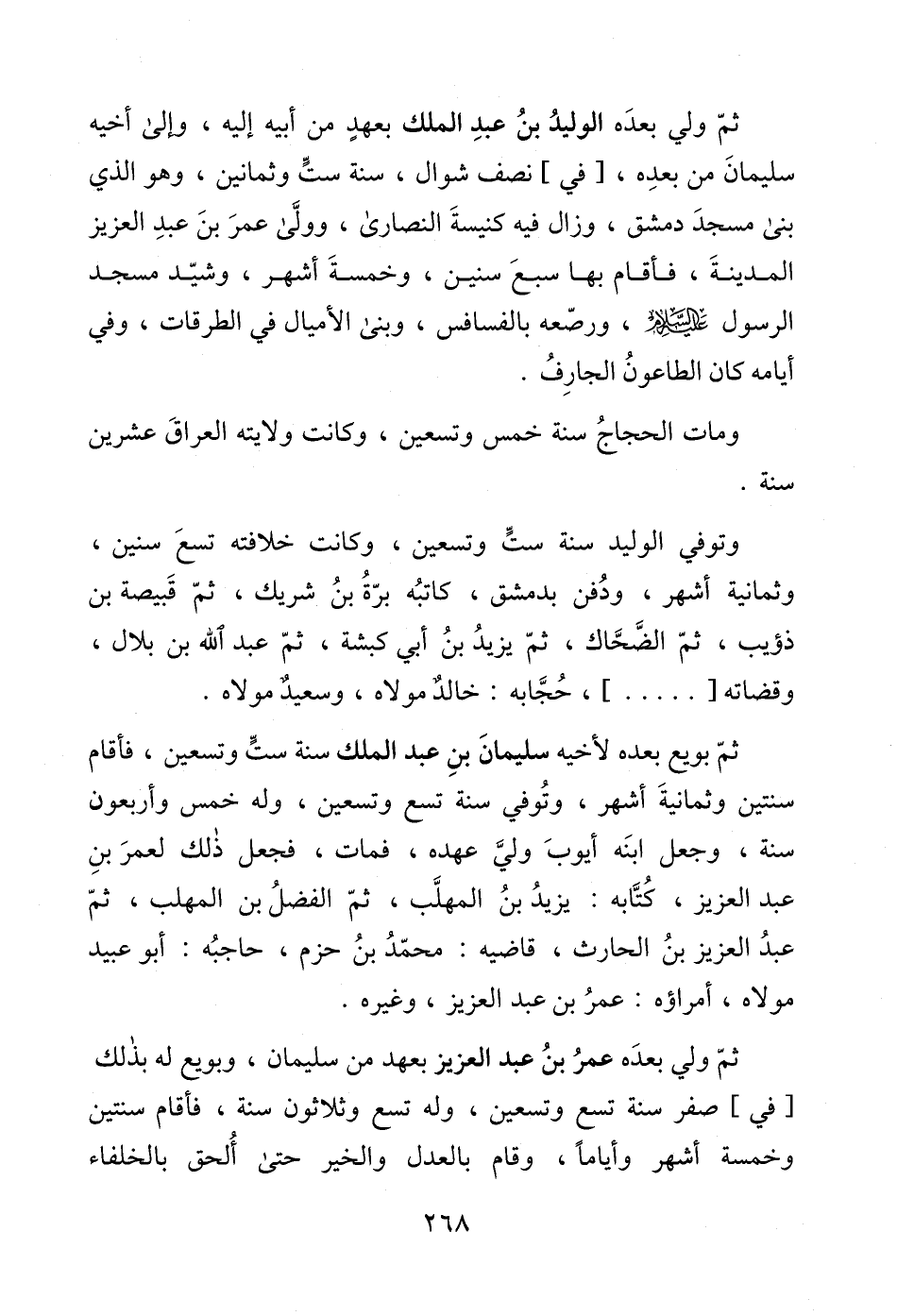 ثمّ ولي بعدَه الوليدُ بنُ عبدِ الملك بعهدٍ من أبيه إليه، وإلى أخيه سليمانَ من بعدِه، [في] نصف شوال، سنة ستٍّ وثمانين، وهو الذي بنى مسجدَ دمشق، وزال فيه كنيسةَ النصارى، وولَّى عمرَ بنَ عبدِ العزيز المدينةَ، فأقام بها سبعَ سنين، وخمسةَ أشهر، وشيّد مسجد الرسول -عليه السلام-، ورصعه بالفسافس، وبنى الأميال في الطرقات، وفي أيامه كان الطاعونُ الجارِفُ.