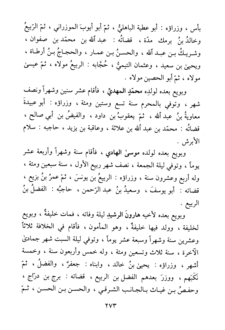 وبويع بعده لأخيه هارونَ الرشيدِ ليلة وفاته، فمات خليفةٌ، وبويع لخليفة، وولد فيها خليفةٌ، وهو المأمون، فأقام في الخلافة ثلاثاً وعشرين سنة وشهراً وسبعة عشر يوماً، وتوفي ليلة السبت شهر جمادى الآخرة، سثة ثلاث وتسعين ومئة، وله خمس وأربعون سنة، وخمسة أشهر، وزراؤه: يحيى بنُ خالد، وابناه: جعفرٌ، والفضلُ، ثمّ بمَبَهم، ووزرَ بعدهم الفضل بن الربيع، قضاته: برج بن درّاج، وحفصُ بن غياث بالجانب الشرقي، والحسن بن الحسن، ثمّ