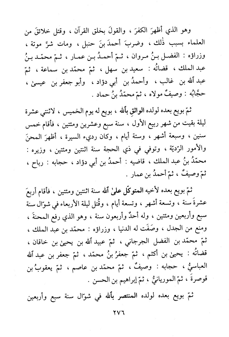 ثمّ بويع بعده لأخيه المتوكّل على الله سنة اثنتين ومئتين، فأقام أربعَ عشرةَ سنة، وتسعة أشهر، وتسعة أيام، وقُتل ليلة الأربعاء في شوّال سنة سبع وأربعين ومئتين، وله أحدٌ وأربعون سنة، وهو الذي رفع المحنةَ، ومنع من الجدل، وصَفَت له الدنيا، وزراؤه: محمد بن عبد الملك، ثمّ محمد بن الفضل الجرجاني، ثمّ عبيد الله بن يحيى بن خاقان، قضاتُه: يحيى بن أكثم، ثمّ جعفرُ بنُ محمد، ثمّ جعفر بن عبد الله العباسيُّ، حجابه: وصيفٌ، ثمّ محمد بن عاصم، ثمّ يعقوبُ بن قوصرةَ، ثمّ الموريانيُّ، ثمّ إبراهيم بن الحسن.