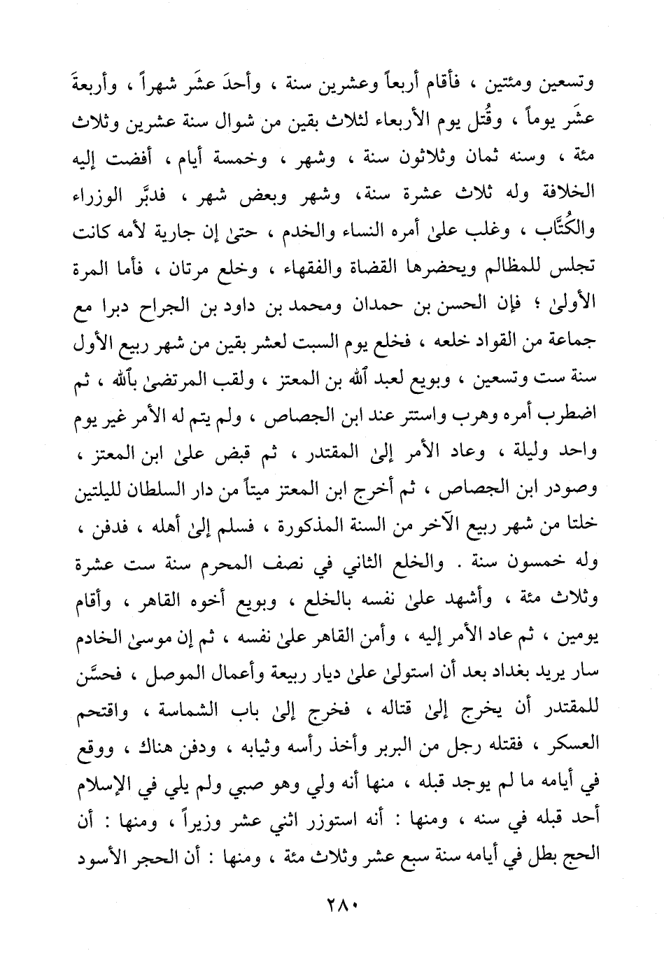 وتسعين ومئتين، فأقام أربعاً وعشرين سنة، وأحدَ عشَر شهراً، وأربعةَ عشَر يوماً، وقُتل يوم الأربعاء لثلاث بقين من شوال سنة عشرين وثلاث مئة، وسنه ثمان وثلاثون سنة، وشهر، وخمسة أيام، أفضت إليه الخلافة وله ثلاث عشرة سنة، وشهر وبعض شهر، فدبَّر الوزراء والكُتَّاب، وغلب على أمره النساء والخدم، حتى إن جارية لأمه كانت تجلس للمظالم ويحضرها القضاة والفقهاء، وخلع مرتان، فأما المرة الأولى؛ فإن الحسن بن حمدان ومحمد بن داود بن الجراح دبرا مع جماعةٌ من القواد خلعه، فخلع يوم السبت لعشر بقين من شهر ربيع الأول سنة ست وتسعين، وبويع لعبد الله بن المعتز، ولقب المرتضى بالله، ثمّ اضطرب أمره وهرب واستتر عند ابن الجصاص، ولم يتم له الأمر غير يوم واحد وليلة، وعاد الأمر إلى المقتدر، ثمّ قبض على ابن المعتز،