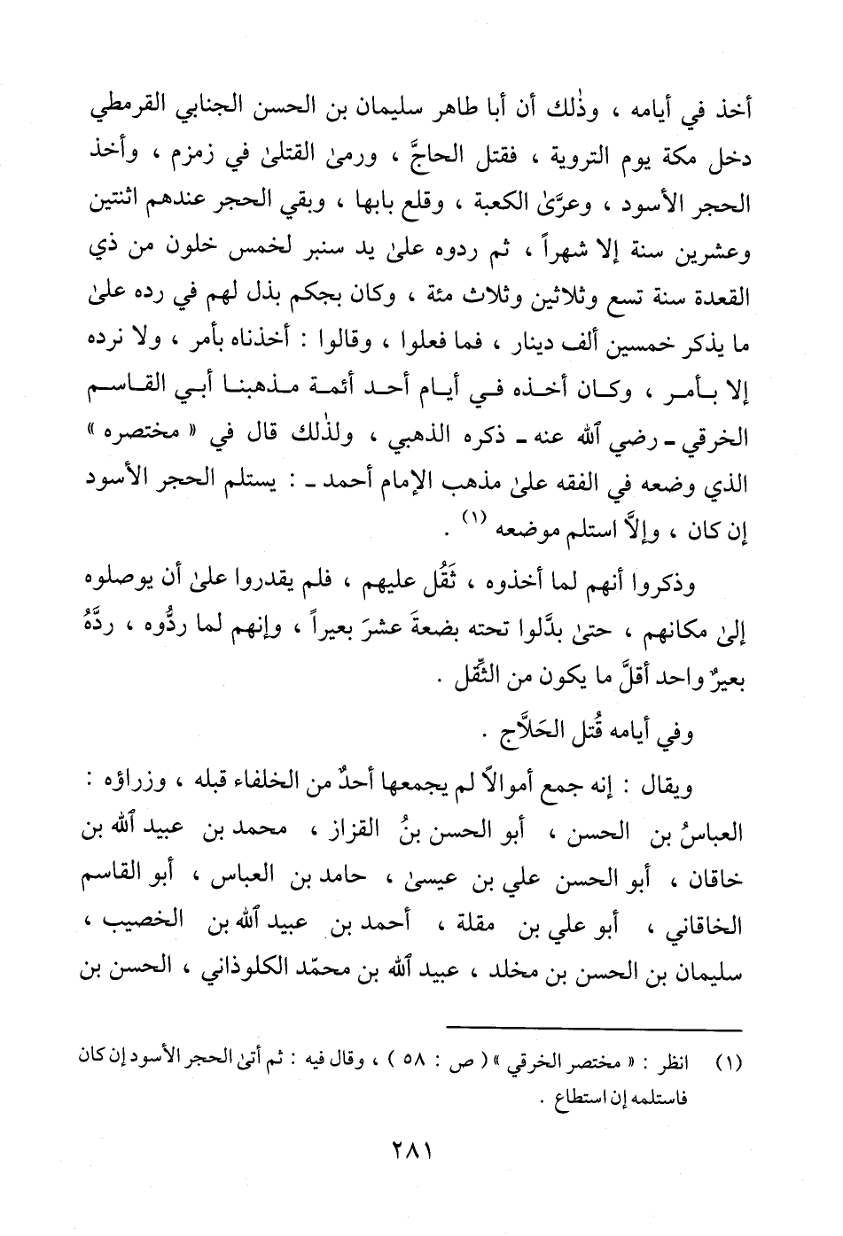 أخذ في أيامه، وذلك أن أبا طاهر سليمان بن الحسن الجنابي القرمطي دخل مكة يوم التروية، فقتل الحاجَّ، ورمى القتلى في زمزم، وأخذ الحجر الأسود، وعرَّى الكعبة، وقلع بابها، وبقي الحجر عندهم اثنتين وعشرين سنة إلا شهراً، ثمّ ردوه على يد سنبر لخمس خلون من ذي القعدة سنة تسع وثلاثين وثلاث مئة، وكان بجكم بذل لهم في رده على ما يذكر خمسين ألف دينار، فما فعلوا، وقالوا: أخذناه بأمر، ولا نرده إلا بأمر، وكان أخذه في أيام أحد أئمة مذهبنا أبي القاسم الخرقي -رضي الله عنه- ذكره الذهبي، ولذلك قال في "مختصره" الذي وضعه في الفقه على مذهب الإمام أحمد-: يستلم الحجر الأسود إن كان، وإلَّا استلم موضعه (¬1).