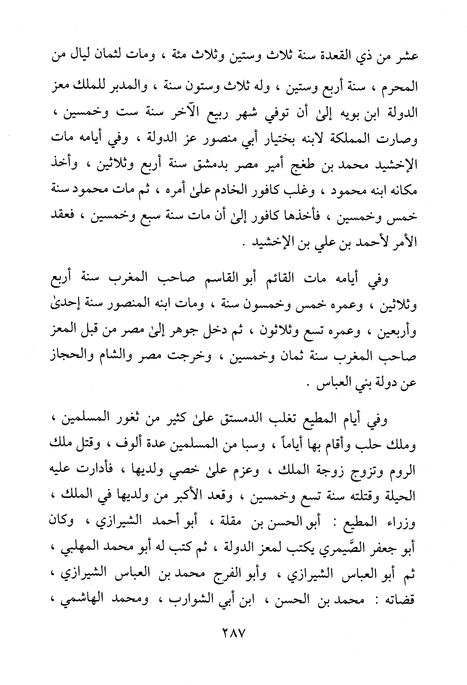 عشر من ذي القعدة سنة ثلاث وستين وثلاث مئة، ومات لثمان ليال من المحرم، سنة أربع وستين، وله ثلاث وستون سنة، والمدبر للملك معز الدولة ابن بويه إلى أن توفي شهر ربيع الآخر سنة ست وخمسين، وصارت المملكة لابنه بختيار أبي منصور عز الدولة، وفي أيامه مات الإخشيد محمد بن طغج أمير مصر بدمشق سنة أربع وثلاثين، وأخذ مكانه ابنه محمود، وغلب كافور الخادم على أمره، ثمّ مات محمود سنة خمس وخمسين، فأخذها كافور إلى أن مات سنة سبع وخمسين، فعقد الأمر لأحمد بن علي بن الإخشيد.