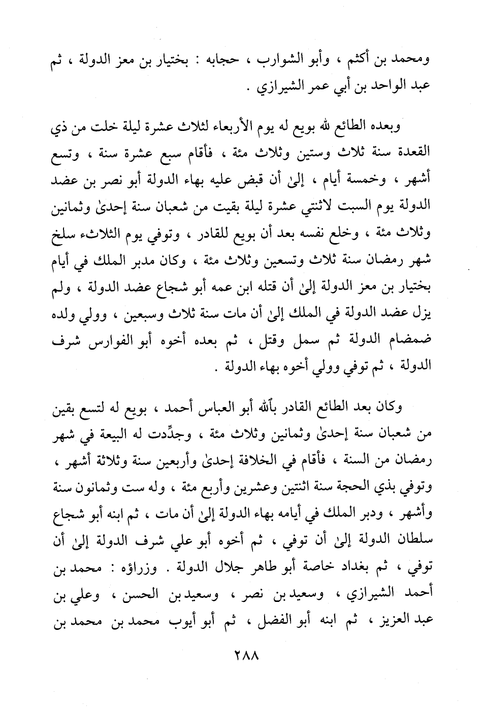وبعده الطائع لله بويع له يوم الأربعاء لثلاث عشرة ليلة خلت من ذي القعدة سنة ثلاث وستين وثلاث مئة، فأقام سبع عشرة سنة، وتسع أشهر، وخمسة أيام، إلى أن قبض عليه بهاء الدولة أبو نصر بن عضد الدولة يوم السبت لاثنتي عشرة ليلة بقيت من شعبان سنة إحدى وثمانين وثلاث مئة، وخلع نفسه بعد أن بويع للقادر، وتوفي يوم الثلاثاء سلخ شهر رمضان سنة ثلاث وتسعين وثلاث مئة، وكان مدبر الملك في أيام بختيار بن معز الدولة إلى أن قتله ابن عمه أبو شجاع عضد الدولة، ولم يزل عضد الدولة في الملك إلى أن مات سنة ثلاث وسبعين، وولي ولده ضمضام الدولة ثمّ سمل وقتل، ثمّ بعده أخوه أبو الفوارس شرف الدولة، ثمّ توفي وولي أخوه بهاء الدولة.