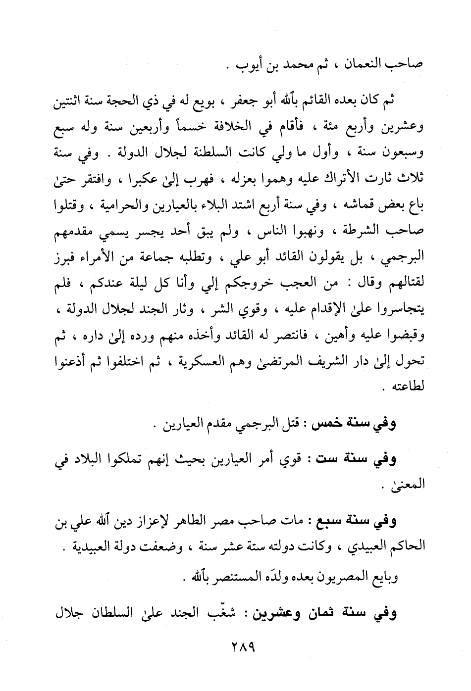 ثمّ كان بعده القائم بالله أبو جعفر، بويع له في ذي الحجة سنة اثنتين وعشرين وأربع مئة، فأقام في الخلافة خسماً وأربعين سنة وله سبع وسبعون سنة، وأول ما ولي كانت السلطنة لجلال الدولة. وفي سنة ثلاث ثارت الأتراك عليه وهموا بعزله، فهرب إلى عكبرا، وافتقر حتى باع بعض قماشه، وفي سنة أربع اشتد البلاء بالعيارين والحرامية، وقتلوا صاحب الشرطة، ونهبوا الناس، ولم يبق أحد يجسر يسمي مقدمهم البرجمي، بل يقولون القائد أبو على، وتطلبه جماعةٌ من الأمراء فبرز لقتالهم وقال: من العجب خروجكم إلي وأنا كل ليلة عندكم، فلم يتجاسروا على الإقدام عليه، وقوي الشر، وثار الجند لجلال الدولة، وقبضوا عليه وأهين، فانتصر له القائد وأخذه منهم ورده إلى داره، ثمّ تحول إلى دار الشريف المرتضى وهم العسكرية، ثمّ اختلفوا ثمّ أذعنوا لطاعته.