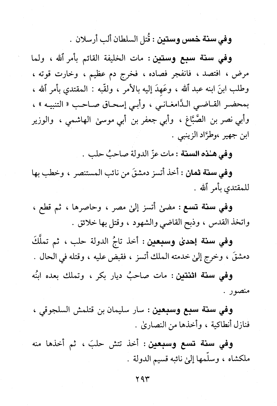 وفي سنة ثمان: أخذ أتسز دمشقَ من نائب المستنصر، وخطب بها للمقتدي بأمر الله.