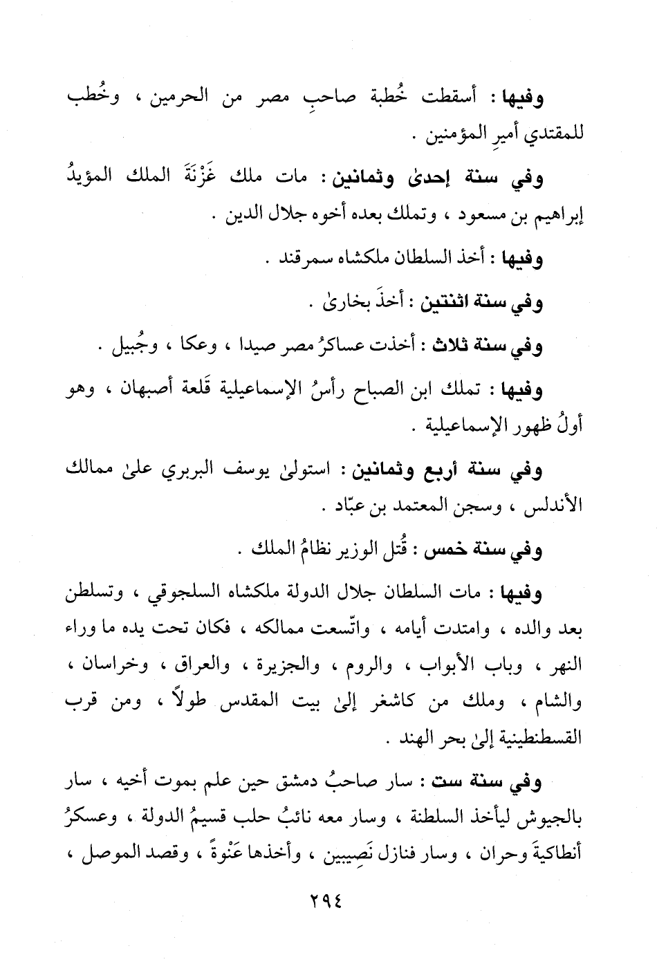 وفيها: مات السلطان جلال الدولة ملكشاه السلجوقي، وتسلطن بعد والده، وامتدت أيامه، واتّسعت ممالكه، فكان تحت يده ما وراء النهر، وباب الأبواب، والروم، والجزيرة، والعراق، وخراسان، والشام، وملك من كاشغر إلى بيت المقدس طولاً، ومن قرب القسطنطينية إلى بحر الهند.