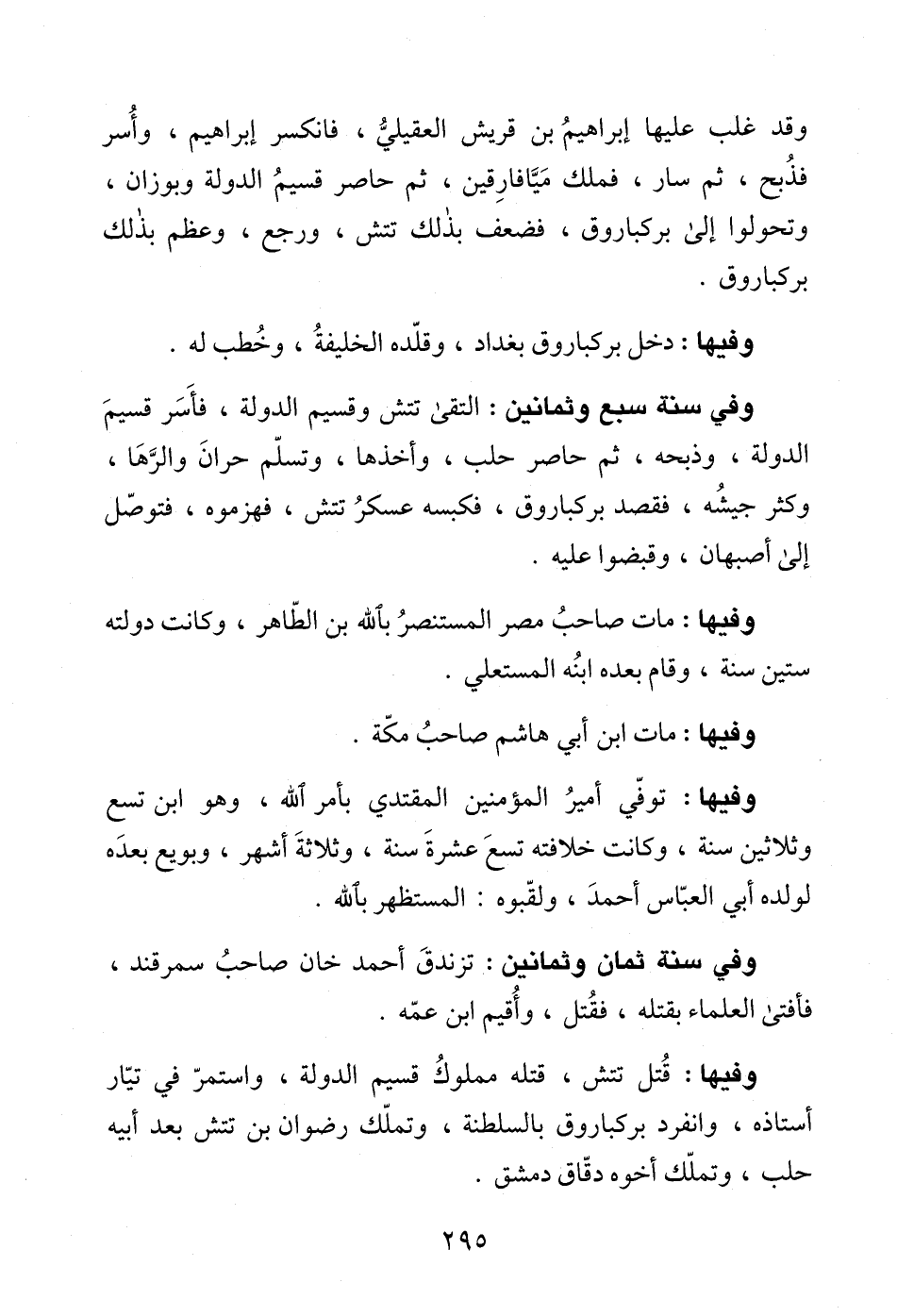وفيها: قُتل تتش، قتله مملوكُ قسيم الدولة، واستمرّ في تيّار أستاذه، وانفرد بركباروق بالسلطنة، وتملّك رضوان بن تتش بعد أبيه حلب، وتملّك أخوه دقّاق دمشق.