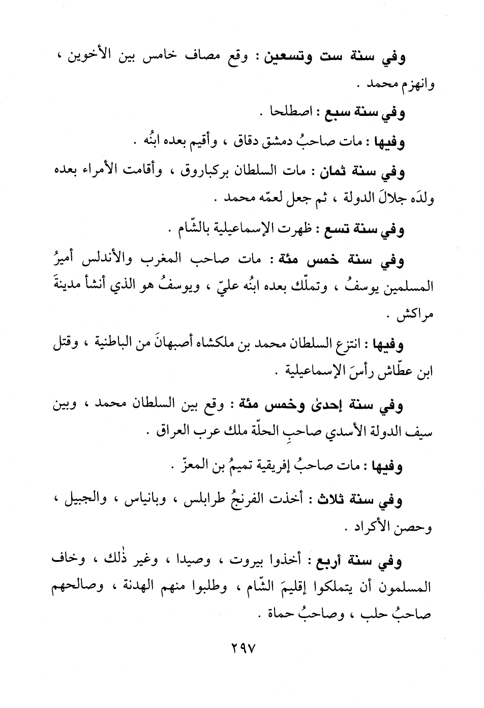 وفي سنة ثلاث: أخذت الفرنجُ طرابلس، وبانياس، والجبيل، وحصن الأكراد.