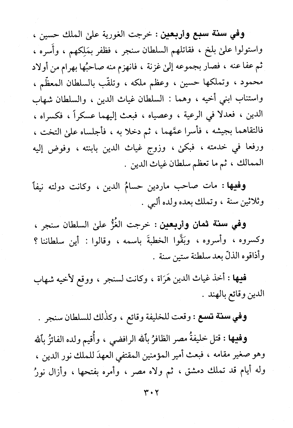 وفي سنة تسع: وقعت للخليفة وقائع، وكذلك للسلطان سنجر.
