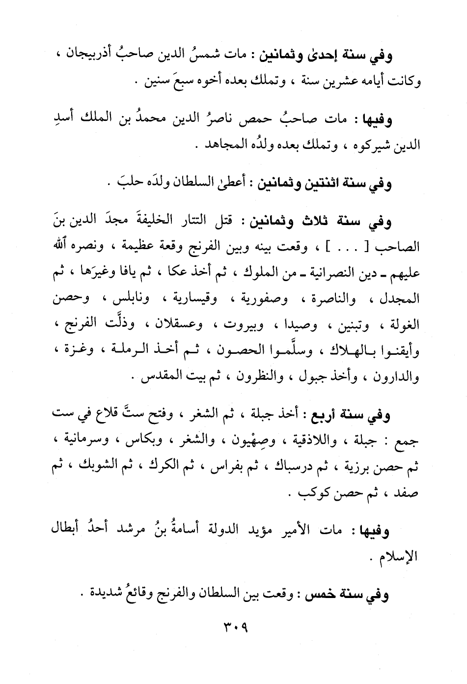 وفي سنة ثلاث وثمانين: قتل التتار الخليفةَ مجدَ الدين بنَ الصاحب [...]، وقعت بينه وبين الفرنج وقعة عظيمة، ونصره الله عليهم -دين النصرانية- من الملوك، ثمّ أخذ عكا، ثمّ يافا وغيرَها، ثمّ المجدل، والناصرة، وصفورية، وقيسارية، ونابلس، وحصن الغولة، وتبنين، وصيدا، وبيروت، وعسقلان، وذلَّت الفرنج، وأيقنوا بالهلاك، وسلَّموا الحصون، ثمّ أخذ الرملة، وغزة، والدارون، وأخذ جبول، والنظرون، ثمّ بيت المقدس.