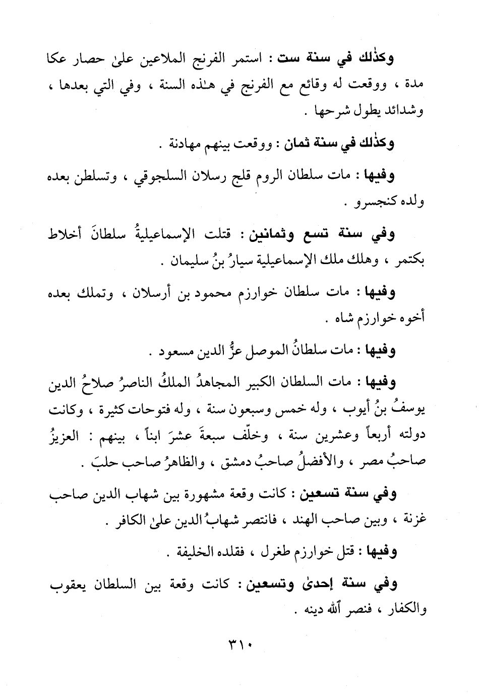 وكذلك في سنة ست: استمر الفرنج الملاعين على حصار عكا مدة، ووقعت له وقائع مع الفرنج في هذه السنة، وفي التي بعدها، وشدائد يطول شرحها.