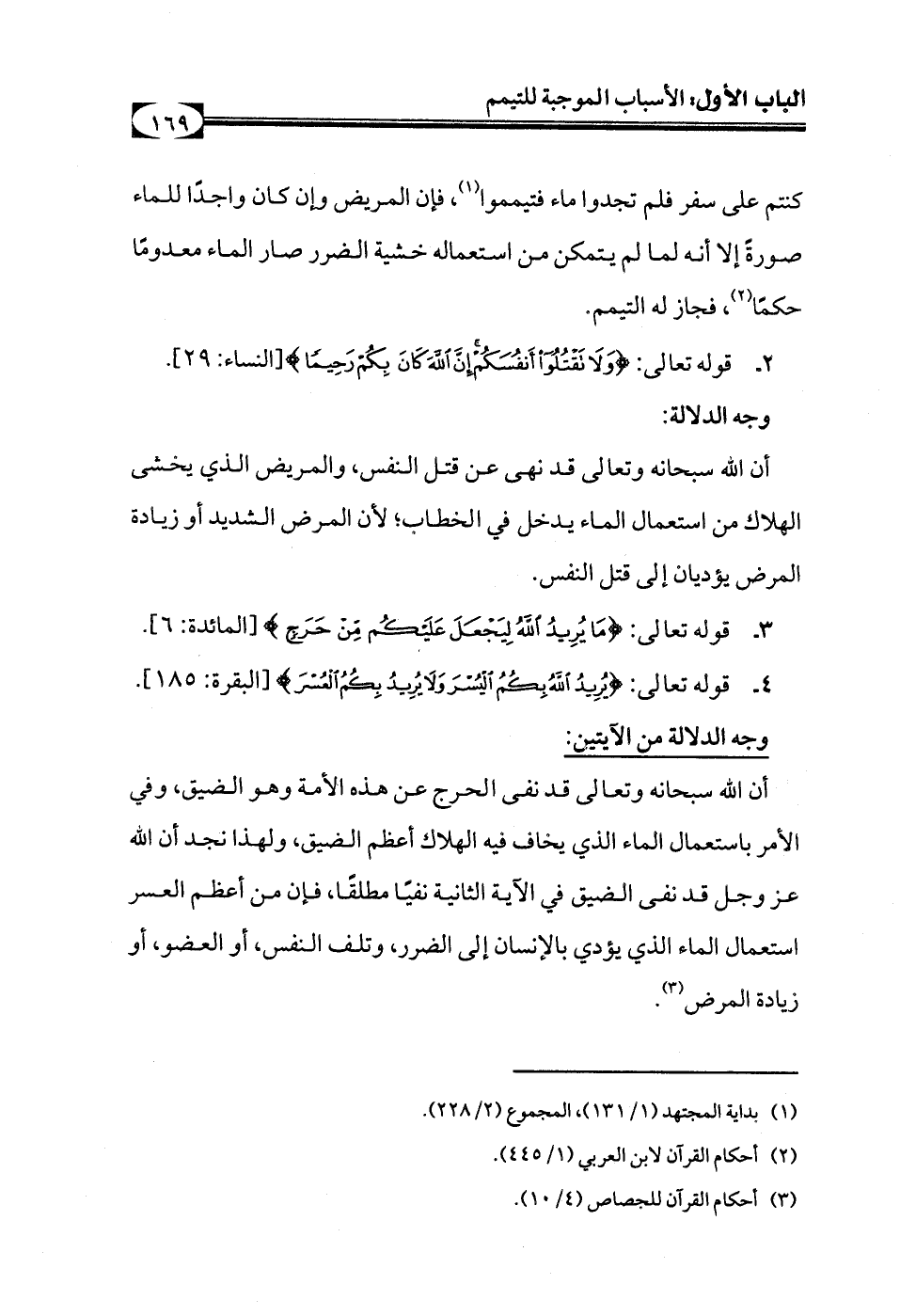 أن الله سبحانه وتعالى قد نفى الحرج عن هذه الأمة وهو الضيق، وفي الأمر باستعمال الماء الذي يخاف فيه الهلاك أعظم الضيق، ولهذا نجد أن الله عز وجل قد نفى الضيق في الآية الثانية نفيًا مطلقًا، فإن من أعظم العسر استعمال الماء الذي يؤدي بالإنسان إلى الضرر وتلف النفس أو العضو، أو زيادة المرض (¬3).
