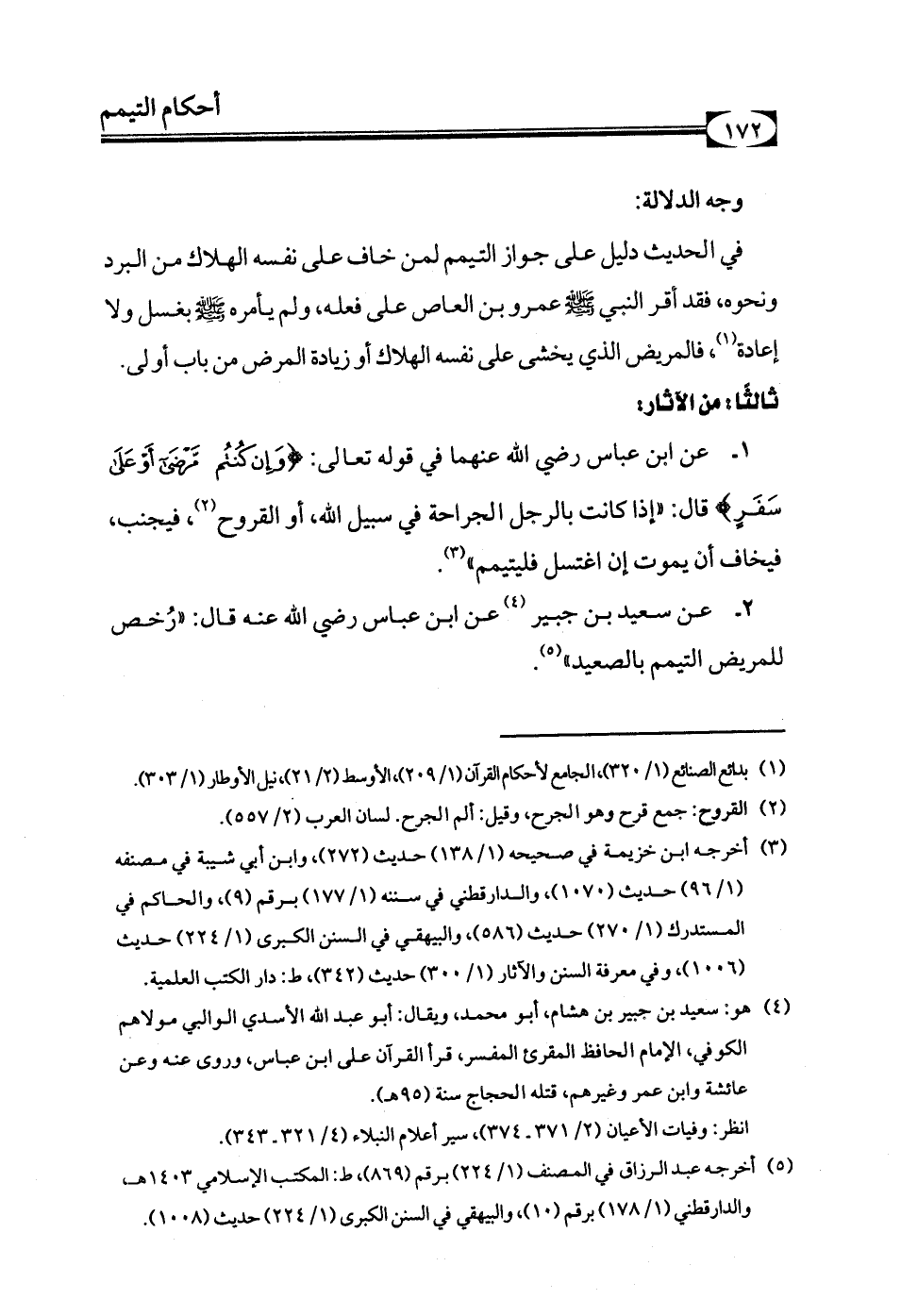 1ـ عن ابن عباس رضي الله عنهما في قوله تعالى: {وَإِنْ كُنْتُمْ مَرْضَى أَوْ عَلَى سَفَرٍ} قال: «إذا كانت بالرجل الجراحة في سبيل الله، أو القروح (¬2)، فيجنب، فيخاف أن يموت إن اغتسل فليتيمم» (¬3).