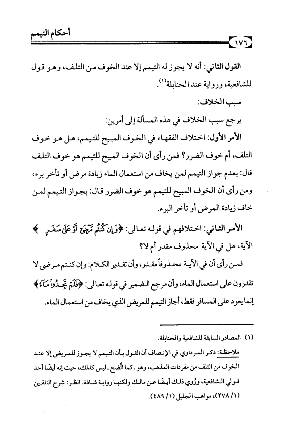 ملاحظة: ذكر المرداوي في الإنصاف أن القول بأن التيمم لا يجوز للمريض إلا عند الخوف من التلف من مفردات المذهب، وهو ـ كما اتَّضح ـ ليس كذلك، حيث إنه أيضًا أحد قولي الشافعية، وروي ذلك أيضًا عن مالك ولكنها رواية شاذة. انظر: شرح التلقين (1/ 278)، مواهب الجليل (1/ 489).