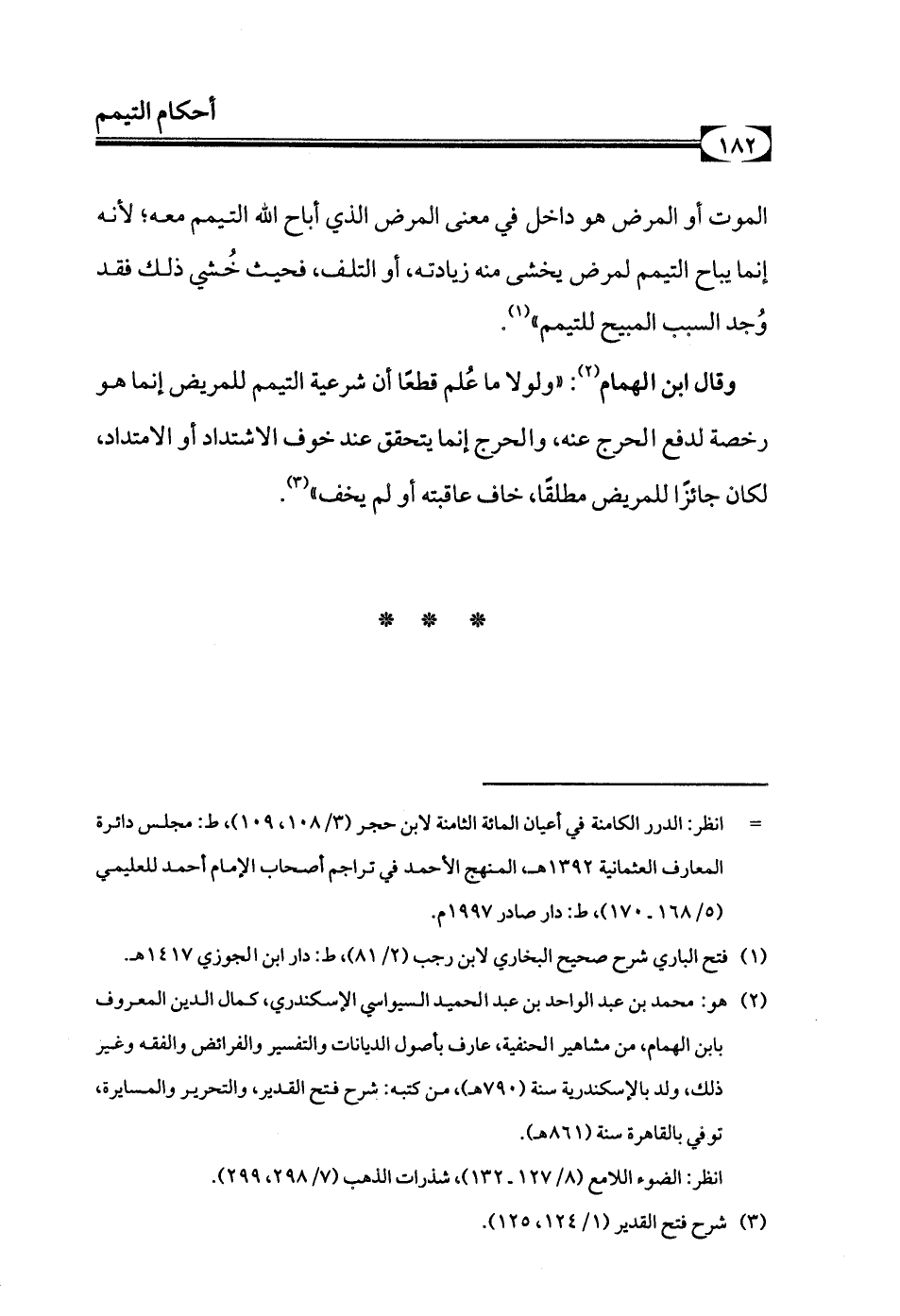 (¬2) هو: محمد بن عبد الواحد بن عبد الحميد السيواسي الإسكندري، كمال الدين المعروف بابن الهمام، من مشاهير الحنفية، عارف بأصول الديانات والتفسير والفرائض والفقه وغير ذلك، ولد بالإسكندرية سنة (790هـ)، من كتبه: شرح فتح القدير، والتحرير والمسايرة، توفي بالقاهرة سنة (861هـ).