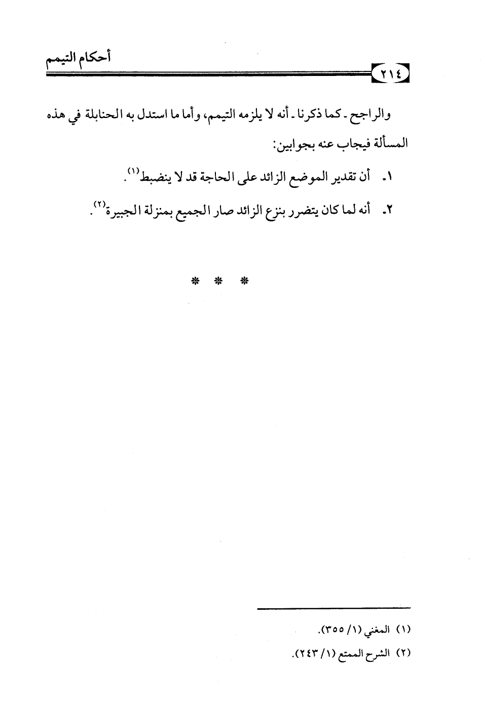 والراجح ـ كما ذكرنا ـ أنه لا يلزمه التيمم، وأما ما استدل به الحنابلة في هذه المسألة فيجاب عنه بجوابين: