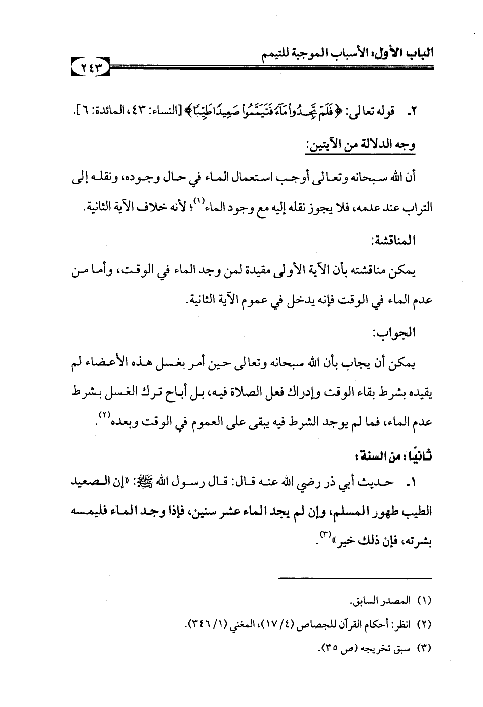 1ـ حديث أبي ذر رضي الله عنه قال: قال رسول الله - صلى الله عليه وسلم -: «إن الصعيد الطيب طهور المسلم، وإن لم يجد الماء عشر سنين، فإذا وجد الماء فليمسه بشرته، فإن ذلك خير» (¬3).