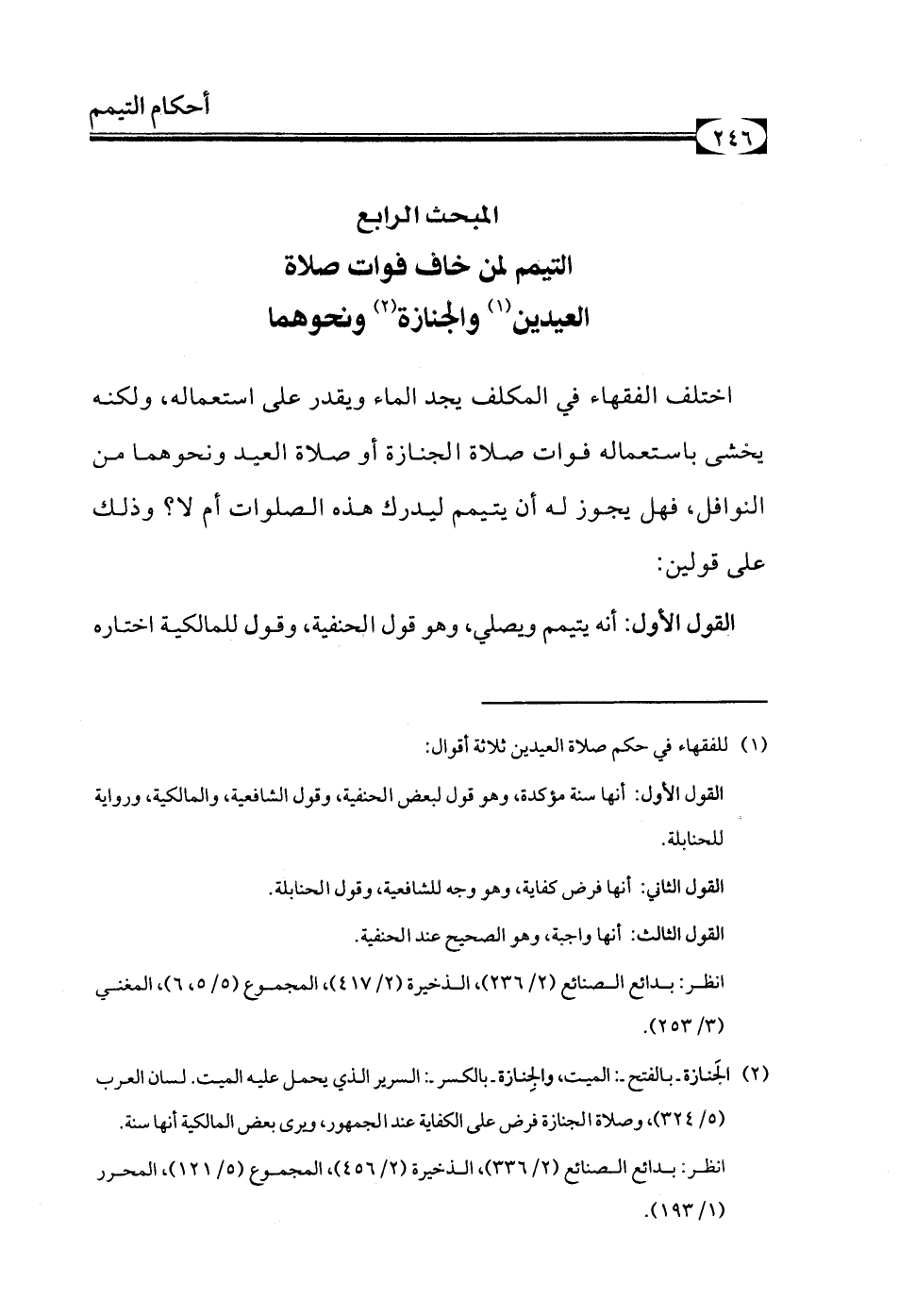 اختلف الفقهاء في المكلف يجد الماء ويقدر على استعماله، ولكنه يخشى باستعماله فوات صلاة الجنازة أو صلاة العيد ونحوهما من النوافل، فهل يجوز له أن يتيمم ليدرك هذه الصلوات أم لا؟ وذلك على قولين:
