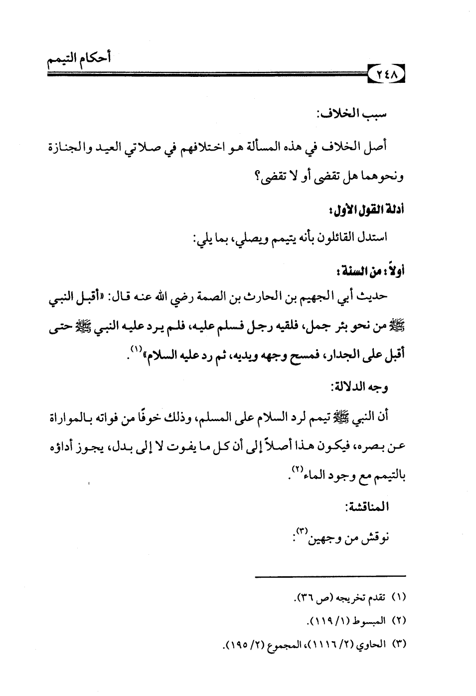 حديث أبي الجهيم بن الحارث بن الصمة رضي الله عنه قال: «أقبل النبي - صلى الله عليه وسلم - من نحو بئر جمل، فلقيه رجل فسلم عليه، فلم يرد عليه النبي - صلى الله عليه وسلم - حتى أقبل على الجدار فمسح وجهه ويديه، ثم رد عليه السلام» (¬1).
