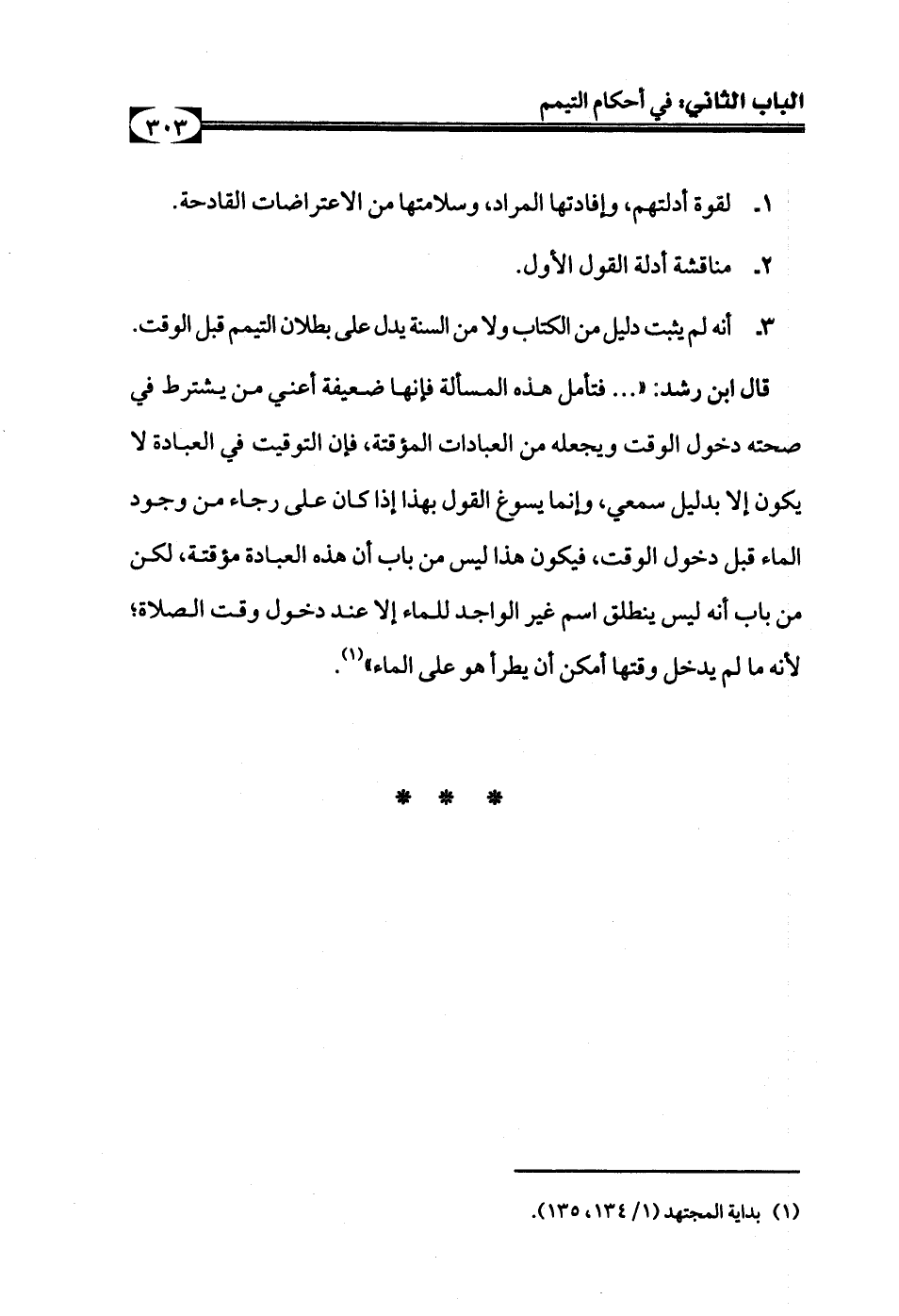قال ابن رشد: «... فتأمل هذه المسألة فإنها ضعيفة أعني من يشترط في صحته دخول الوقت ويجعله من العبادات المؤقتة، فإن التوقيت في العبادة لا يكون إلا بدليل سمعي، وإنما يسوغ القول بهذا إذا كان على رجاء من وجود الماء قبل دخول الوقت، فيكون هذا ليس من باب أن هذه العبادة مؤقتة، لكن من باب أنه ليس ينطلق اسم غير الواجد للماء إلا عند دخول وقت الصلاة؛ لأنه ما لم يدخل وقتها أمكن أن يطرأ هو على الماء» (¬1).