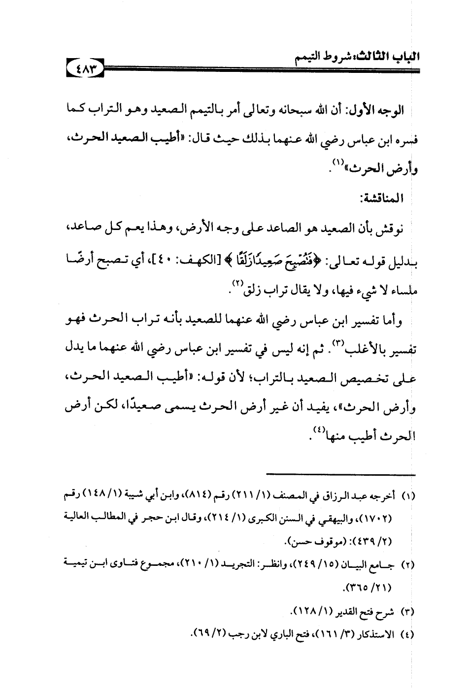 وأما تفسير ابن عباس رضي الله عنهما للصعيد بأنه تراب الحرث فهو تفسير بالأغلب (¬3)، ثم إنه ليس في تفسير ابن عباس رضي الله عنهما ما يدل على تخصيص الصعيد بالتراب؛ لأن قوله: «أطيب الصعيد الحرث، وأرض الحرث»، يفيد أن غير أرض الحرث يسمى صعيدًا، لكن أرض الحرث أطيب منها (¬4).