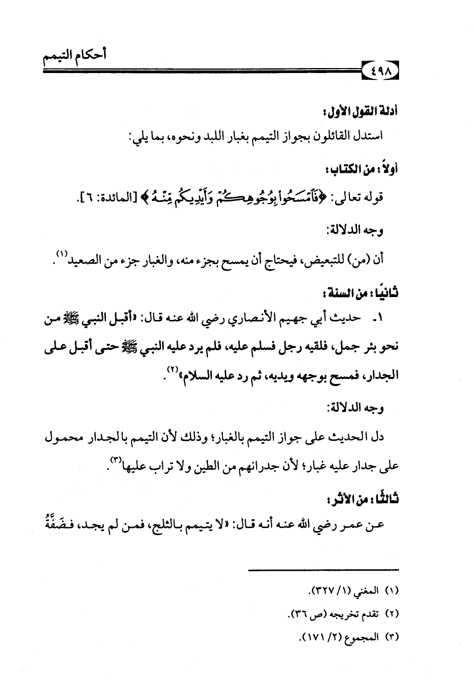 حديث أبي جهيم الأنصاري رضي الله عنه قال: «أقبل النبي - صلى الله عليه وسلم - من نحو بئر جمل، فلقيه رجل فسلم عليه، فلم يرد عليه النبي - صلى الله عليه وسلم - حتى أقبل على الجدار فمسح بوجهه ويديه، ثم رد عليه السلام» (¬2).
