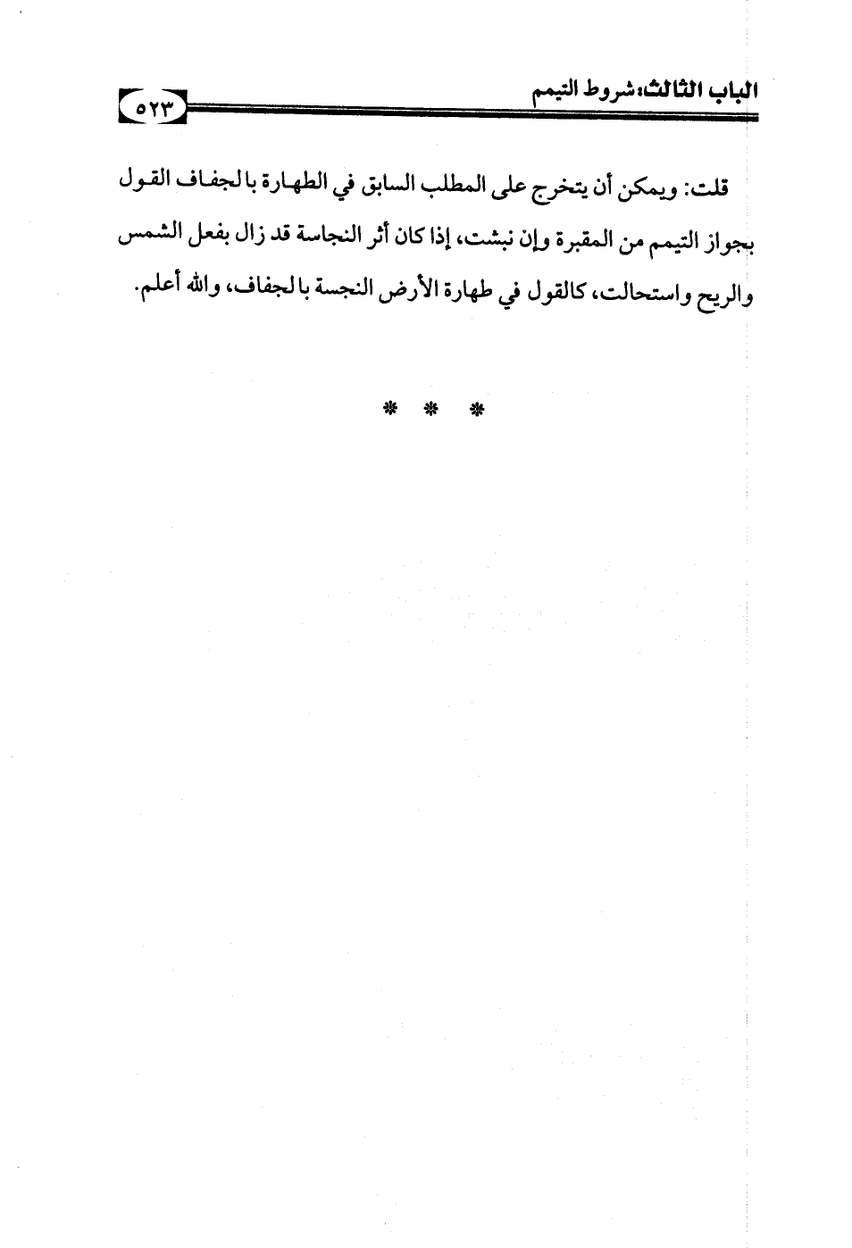 قلت: ويمكن أن يتخرج على المطلب السابق في الطهارة بالجفاف القول بجواز التيمم من المقبرة وإن نبشت، إذا كان أثر النجاسة قد زال بفعل الشمس والريح واستحالت، كالقول في طهارة الأرض النجسة بالجفاف، والله أعلم.
