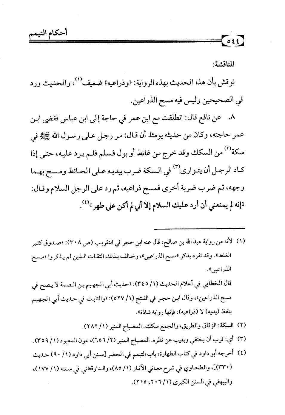 (¬1) لأنه من رواية عبد الله بن صالح، قال عنه ابن حجر في التقريب (ص 308): «صدوق كثير الغلط»، وقد تفرد بذكر «مسح الذراعين»، وخالف بذلك الثقات الذين لم يذكروا «مسح الذراعين».