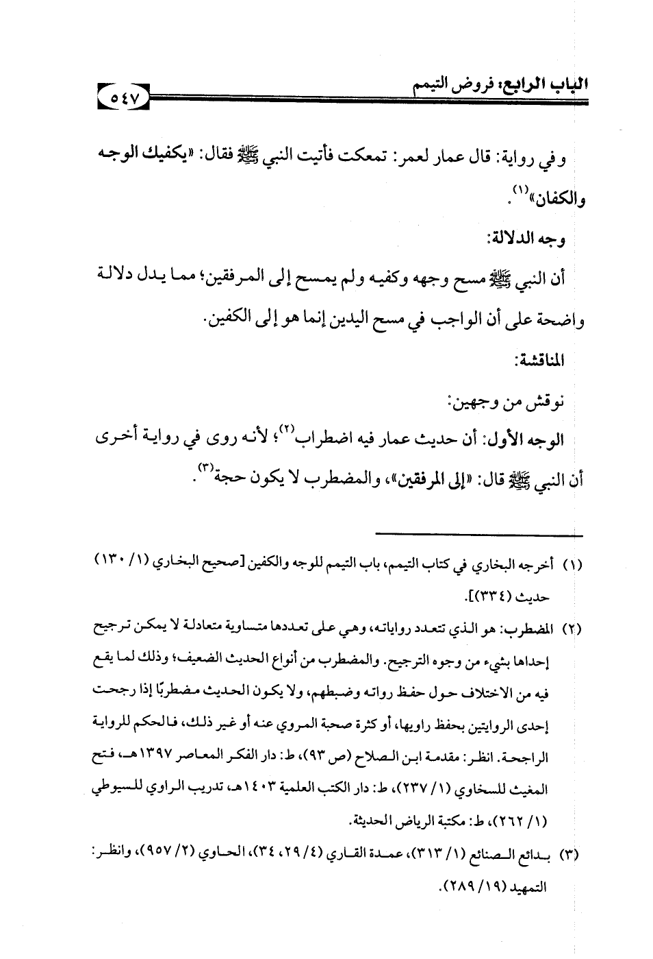 (¬1) أخرجه البخاري في كتاب التيمم، باب التيمم للوجه والكفين [صحيح البخاري (1/ 130) حديث (334)].