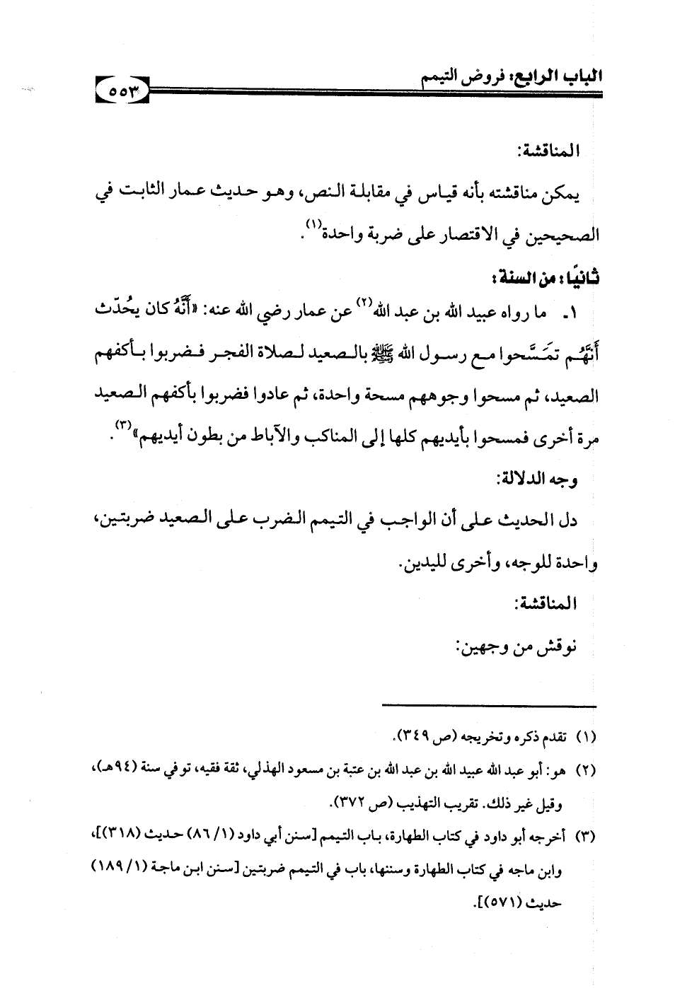 (¬3) أخرجه أبو داود في كتاب الطهارة، باب التيمم [سنن أبي داود (1/ 86) حديث (318)]، وابن ماجه في كتاب الطهارة وسننها، باب في التيمم ضربتين [سنن ابن ماجة (1/ 189) حديث (571)].