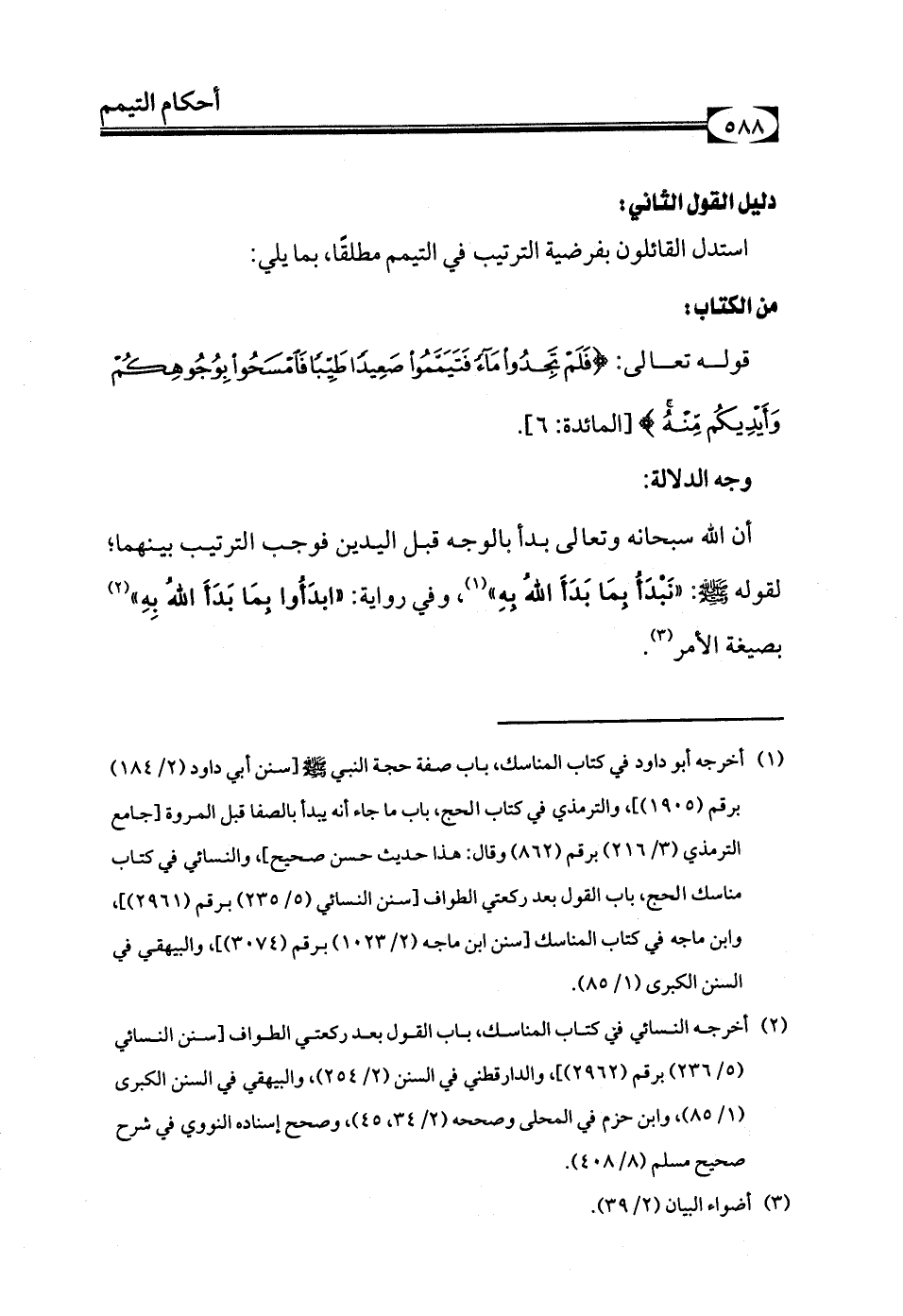 أن الله سبحانه وتعالى بدأ بالوجه قبل اليدين فوجب الترتيب بينهما؛ لقوله - صلى الله عليه وسلم -: «نبدأ بما بدأ الله به» (¬1)، وفي رواية: «ابدأوا بما بدأ الله به» (¬2) بصيغة الأمر (¬3).