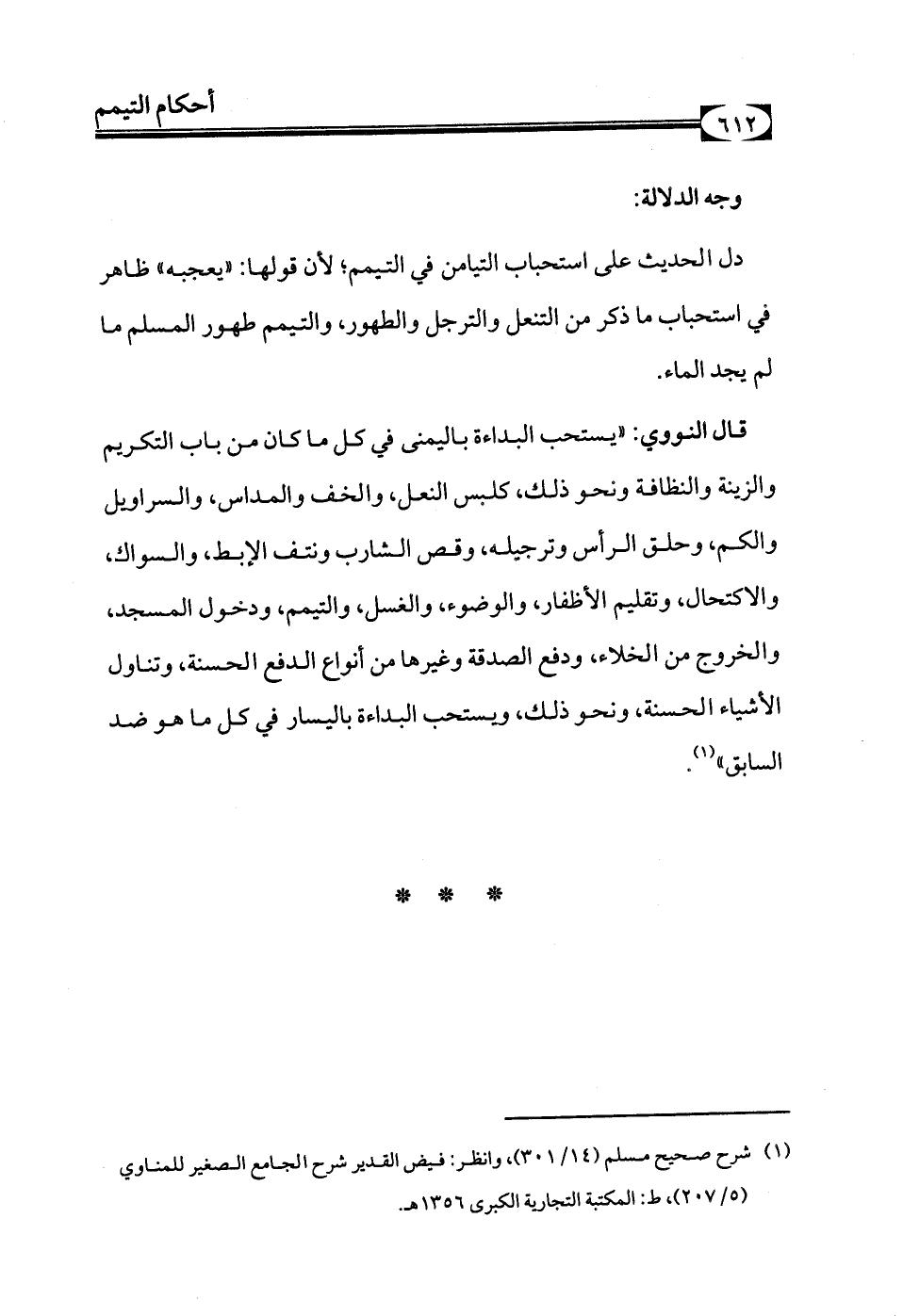 قال النووي: «يستحب البداءة باليمنى في كل ما كان من باب التكريم والزينة والنظافة ونحو ذلك، كلبس النعل، والخف والمداس، والسراويل والكم، وحلق الرأس وترجيله، وقص الشارب ونتف الإبط، والسواك، والاكتحال، وتقليم الأظفار، والوضوء، والغسل، والتيمم، ودخول المسجد، والخروج من الخلاء، ودفع الصدقة وغيرها من أنواع الدفع الحسنة، وتناول الأشياء الحسنة، ونحو ذلك، ويستحب البداءة باليسار في كل ما هو ضد السابق» (¬1).
