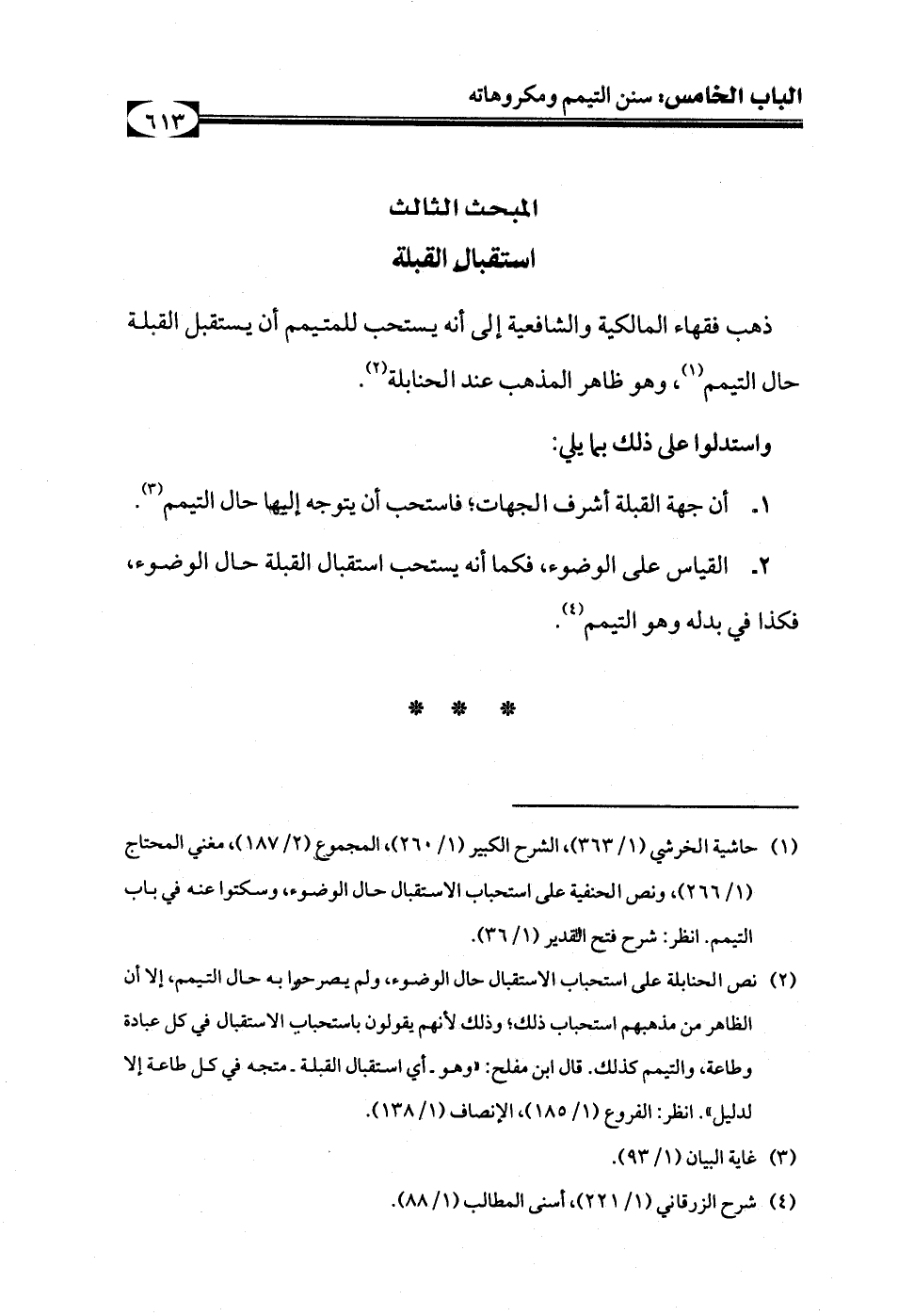 (¬1) حاشية الخرشي (1/ 363)، الشرح الكبير (1/ 260)، المجموع (2/ 187)، مغني المحتاج (1/ 266)، ونص الحنفية على استحباب الاستقبال حال الوضوء، وسكتوا عنه في باب التيمم. انظر: شرح فتح القدير (1/ 36).